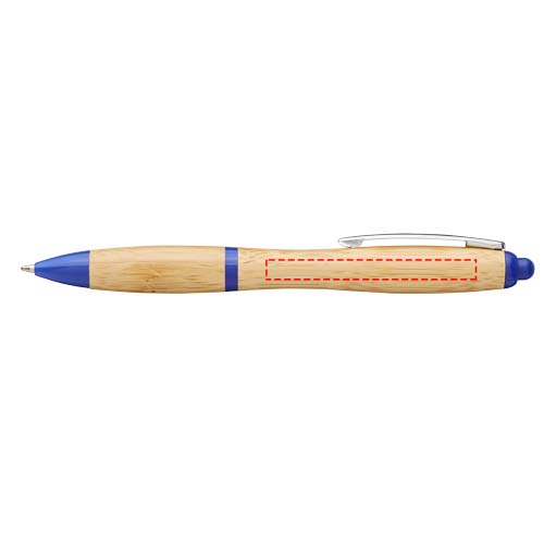 Balpen met klikmechanisme, met een huls van bamboe, geaccentueerd door een verchroomde clip en ABS kunststof sierranden. De kleur van het bamboemateriaal kan variëren.