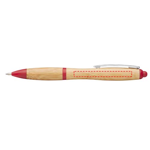 Balpen met klikmechanisme, met een huls van bamboe, geaccentueerd door een verchroomde clip en ABS kunststof sierranden. De kleur van het bamboemateriaal kan variëren.