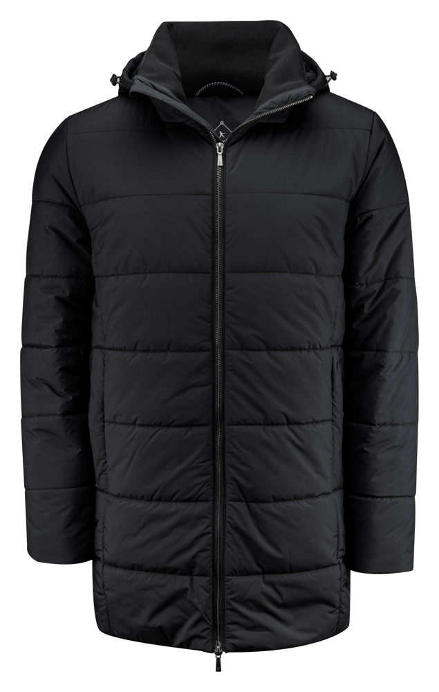 Langere, gewatteerde jas met two-way ritssluiting. Afneembare capuchon. De capuchon is aanpasbaar door middel van elastische koorden. Rib aan de kraag de manchetten. Zijzakken met ritssluiting, binnenzak met ritssluiting. Tricot geborstelde stof aan de binnenzijde van de zakken voor warme handen op koude dagen.