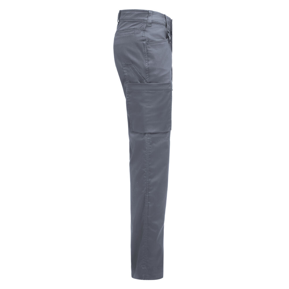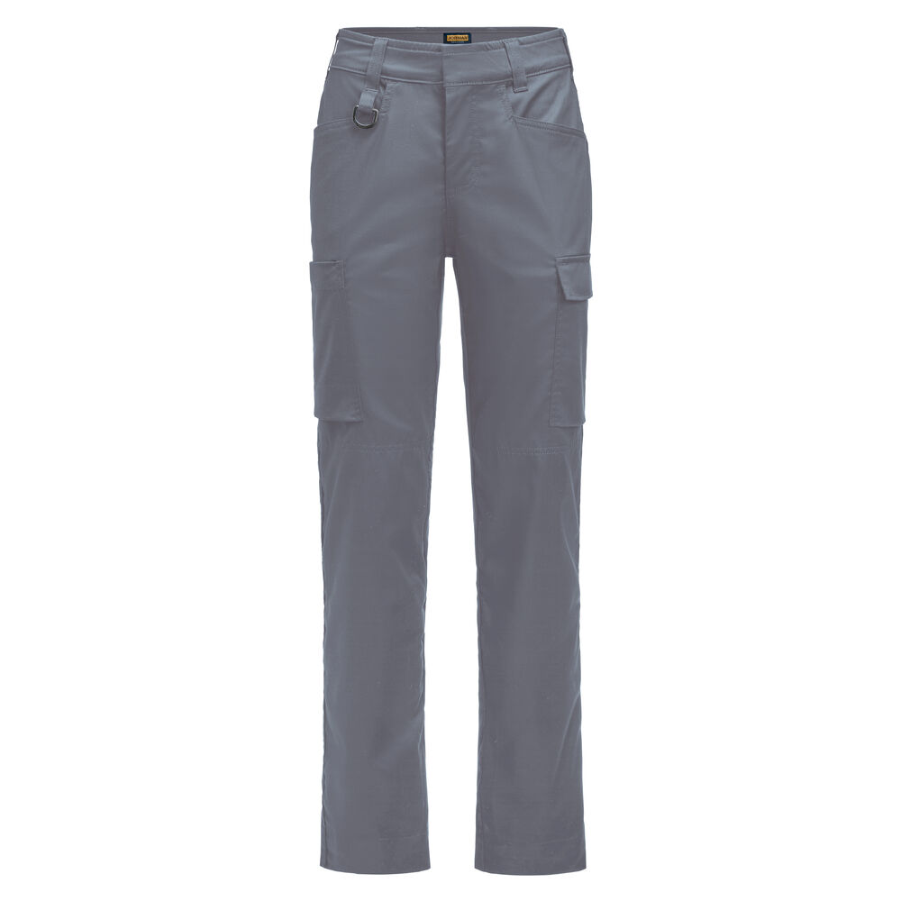 Servicebroek met stretch. Verborgen knoop aan de voorkant voor "Non-scratch" ontwerp. Beenzak aan de rechterkant met ruimte voor een meetlint en beenzak aan de linkerkant met klepzak voor pennen. D-ring aan de voorste riemlus voor een ID-kaarthouder.