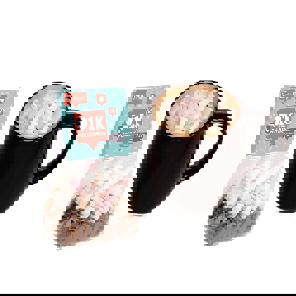 Transparant blokzakje met full colour bedrukt kopkaartje, gevuld met ca. 55 gram chocolade druppels en ca. 15 gram mini marshmallows