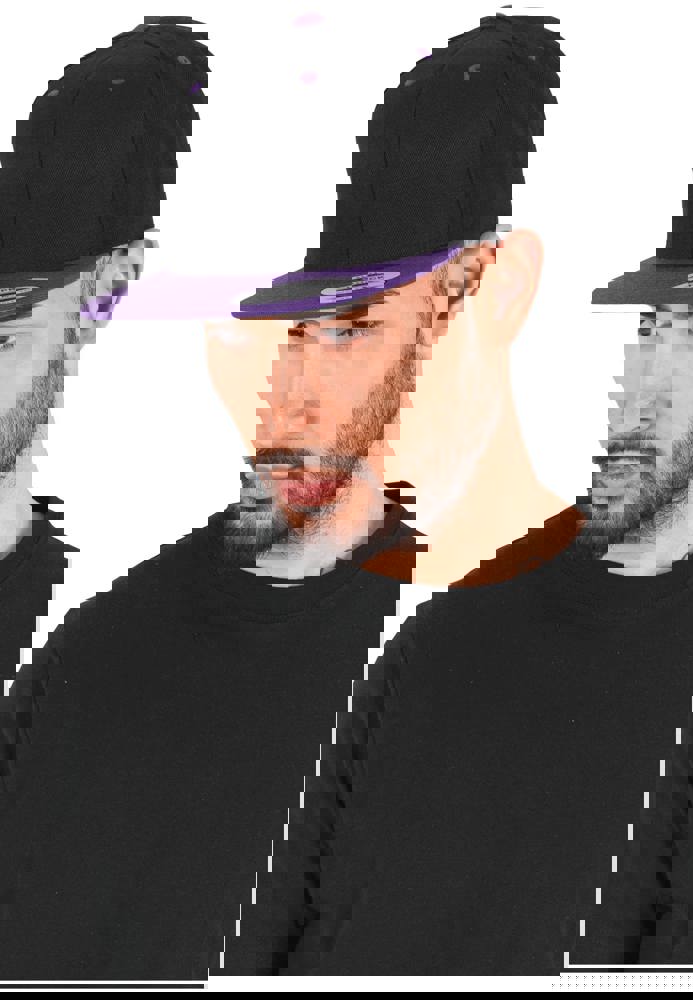 80% acryl, 20% wol. Pet met 6 panelen en een platte zonneklep. Zonneklep, snapbacksluiting en ringetjes in een contrasterende kleur.