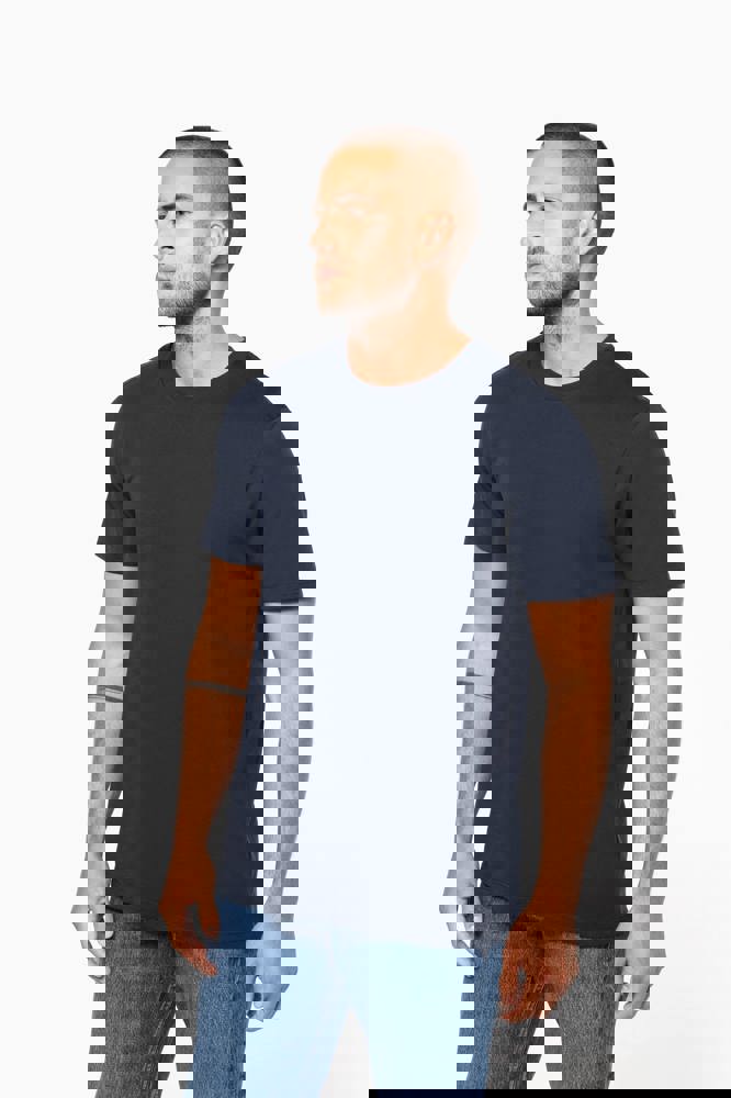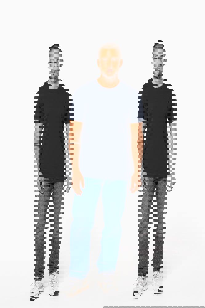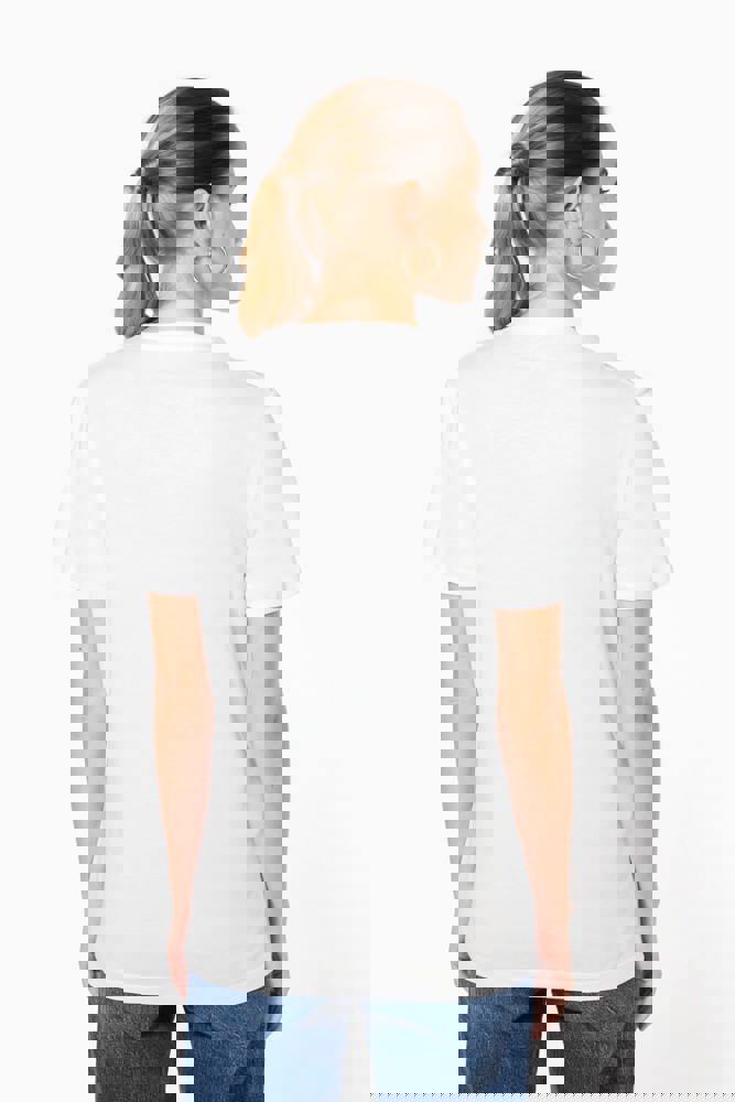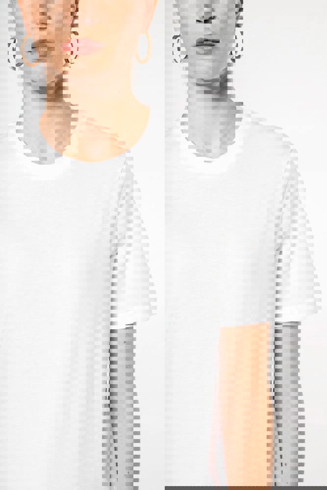 100% katoen. Gekamd katoen. Jersey. Rechte snit. Cut-and-sew-techniek. Ronde hals met toon-op-toon nektape. Versteviging van de schoudernaad met een silicone bandje. De mouwuiteinden en onderkant zijn afgewerkt met een zoom met dubbel stiksel. Geen merklabel, maar enkel een Tear Away-maatlabel voor eenvoudige personalisatie. Gemaakt in Portugal.