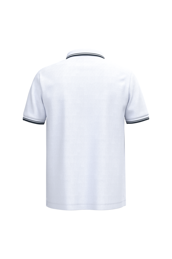 100% katoen. Voor de gevlamde kleuren: 92% katoen / 8% viscose. Gekamd katoen. Piquétricot. Rechte snit. Knooplijst met 2 toon-op-toon knopen aan de kraag. Nektape in de hoofdstof in de kraag. Zijsplitten met een afwerkingsboord in de hoofdstof. Ribboord met contrasterende biesjes aan kraag en mouwuiteinden. Dubbel stiksel aan de onderkant.