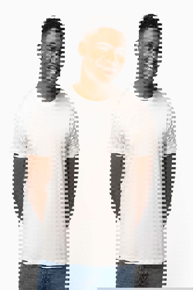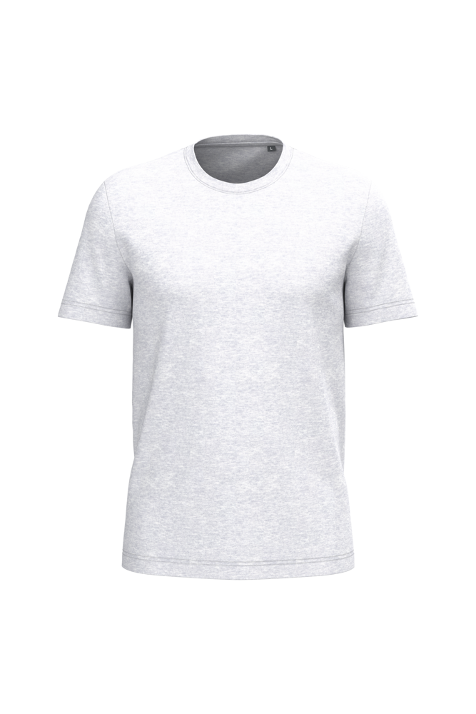 Effen kleuren : 100% katoen. Kleur Ash Heather : 98% katoen / 2% viscose. Kleur Oxford Grey : 90% katoen / 10% viscose. Kleuren Wine Heather ; French Navy Heather ; Green Marble Heather ; Cloudy Blue Heather : 80% katoen / 20% polyester. En kleur Grey Heather : 70% katoen / 30% polyester. Alle kleuren zijn gemaakt van biologisch katoen in omschakeling. Gekamd katoen. Ronde hals in ribboord met elasthan. Toon-op-toon nektape. Buisvormig. Dubbel stiksel aan mouwuiteinden en onderkant.