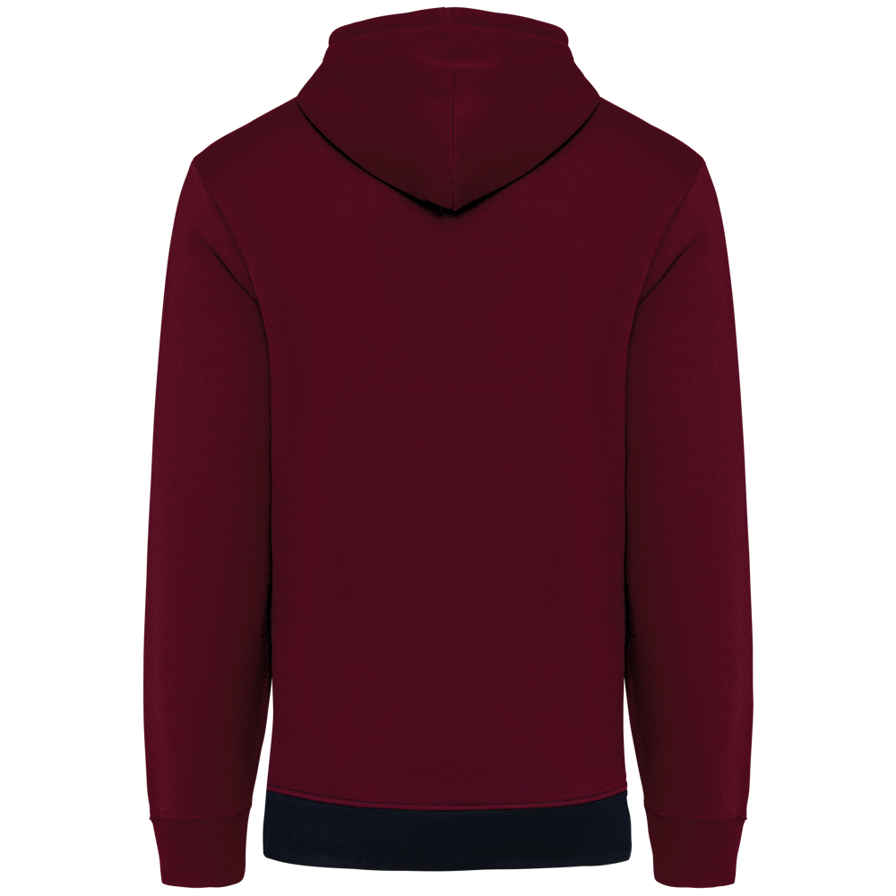 80 % katoen/20 % polyester. Buitenoppervlak 100% gekamd katoen. Rechte snit. Aan de binnenkant geborsteld fleece 3 draden. LSF (Low Shrinkage Fleece). Enzymgewassen. Driekleurige sweater met capuchon met centrale witte streep op alle kleuren. Afwerking ribboord 1x1 aan mouwuiteinde en aan de onderkant in kokervorm voor een betere afwerking, met stiksel. Kangoeroezak met dubbel stiksel. Capuchon met plooien, oogje en metalen koorduiteinden, met ronde aanrijgkoordjes Toon-op-toon nektape met visgraatmotief. In de mouwuiteinden en onderaan zit elastaan om vervorming van het kledingstuk te voorkomen. Halvemaanvormige afwerking op de achterkant voor eenvoudige personalisatie. Afscheurbaar merklabel en maatlabel in de kraag voor eenvoudige personalisatie.