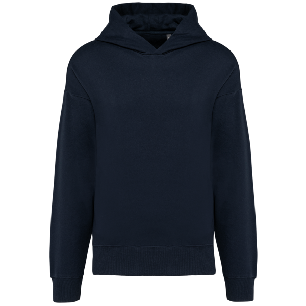 80% katoen / 20% polyester. Oversized model met afhangende schouders. Geborsteld fleece aan de binnenkant. Gekaard katoen. 2x1 ribboord in buisconstructie voor een betere afwerking aan de mouwuiteinden en de onderkant. Verborgen zak met blinde rits in de zijnaad rechts (wanneer gedragen). Gevoerde katoenen capuchon met plooi. In de ribboord aan de mouwuiteinden en onderaan zit elasthaan om vervorming van het kledingstuk te voorkomen. Toon-op-toon nektape met visgraatmotief. Halvemaan in de kraag. Dubbel stiksel aan weerszijden, op de mouwuiteinden en onderaan. Geen merklabel, maar een maatlabel in de kraag voor eenvoudige personalisatie.