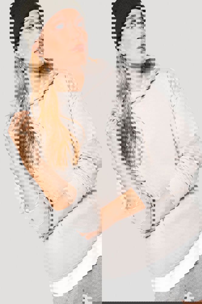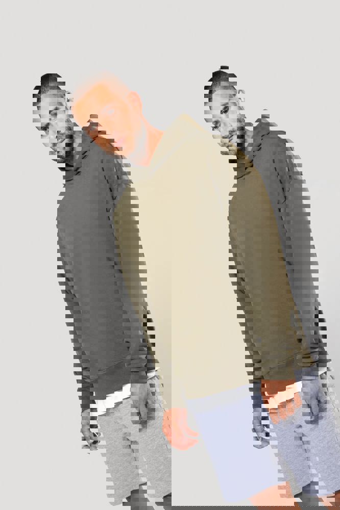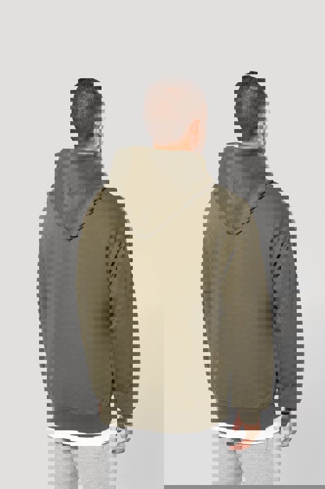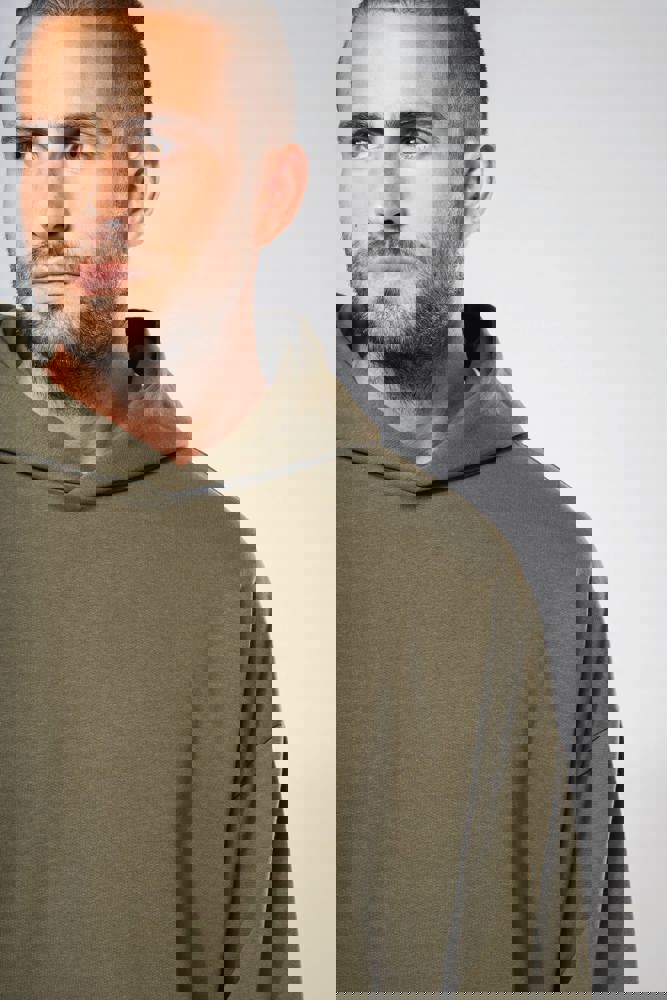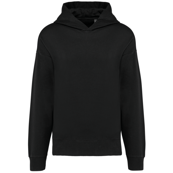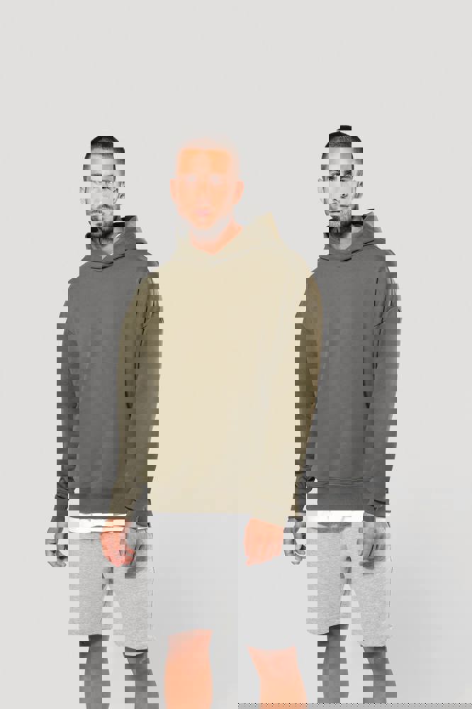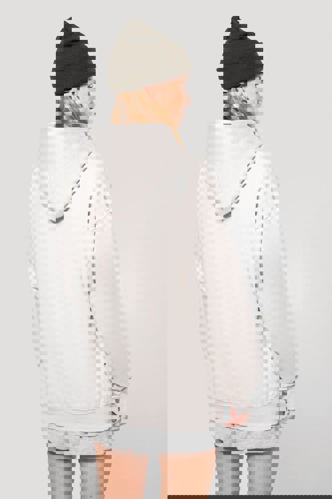 80% katoen / 20% polyester. Oversized model met afhangende schouders. Geborsteld fleece aan de binnenkant. Gekaard katoen. 2x1 ribboord in buisconstructie voor een betere afwerking aan de mouwuiteinden en de onderkant. Verborgen zak met blinde rits in de zijnaad rechts (wanneer gedragen). Gevoerde katoenen capuchon met plooi. In de ribboord aan de mouwuiteinden en onderaan zit elasthaan om vervorming van het kledingstuk te voorkomen. Toon-op-toon nektape met visgraatmotief. Halvemaan in de kraag. Dubbel stiksel aan weerszijden, op de mouwuiteinden en onderaan. Geen merklabel, maar een maatlabel in de kraag voor eenvoudige personalisatie.