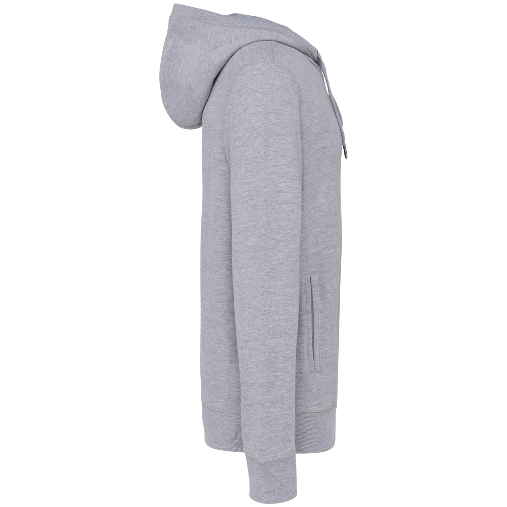 80% biologisch katoen / 20% gerecycleerd polyester post-consumer. Oxford Grey 75% biologisch katoen / 25% gerecycleerd polyester post-consumer. Fleece french terry LST (Low Shrinkage Terry). Stof: enzymgewassen. Rechte snit. 2 omzoomde zakken aan de voorkant. Ribboord aan mouwuiteinden, onderkant en de rand van de gevoerde capuchon, met toon-op-toon aanrijgkoordjes met metalen uiteinde. Halvemaanvormige halsopening op de achterkant, voor eenvoudige personalisatie van het merk aan de binnenkant. Nektape in visgraatmotief aan de binnenzijde van de kraag en V-afwerking aan de halsopening. Geen merklabel in de kraag, maar enkel een maatlabel voor eenvoudige personalisatie.