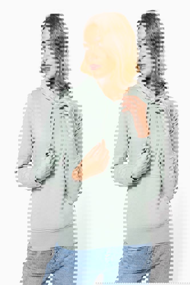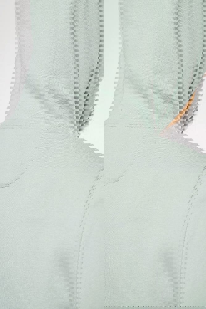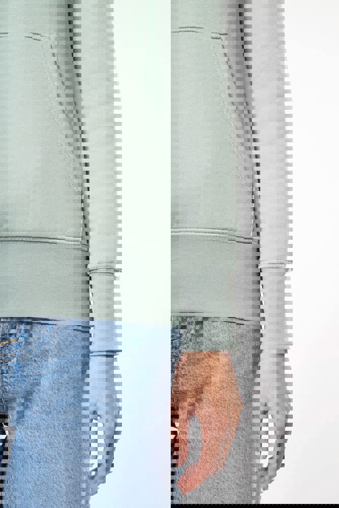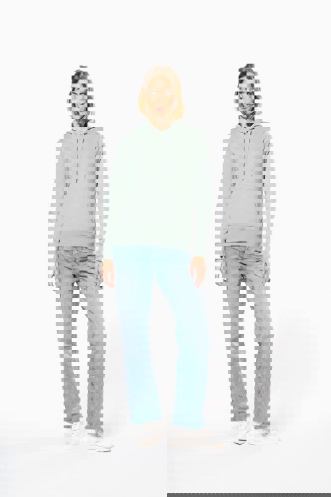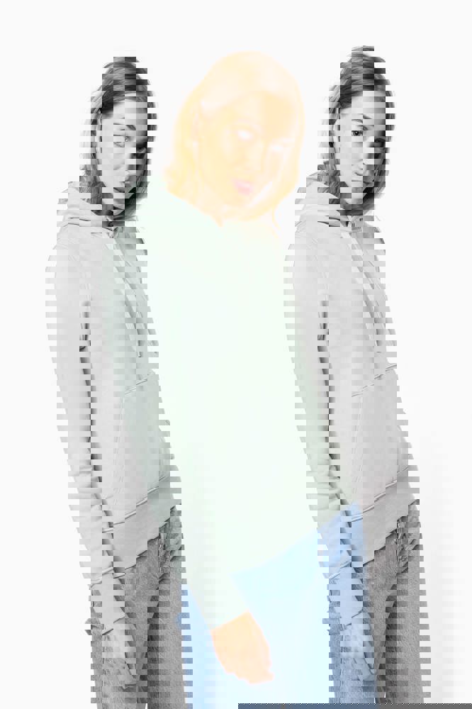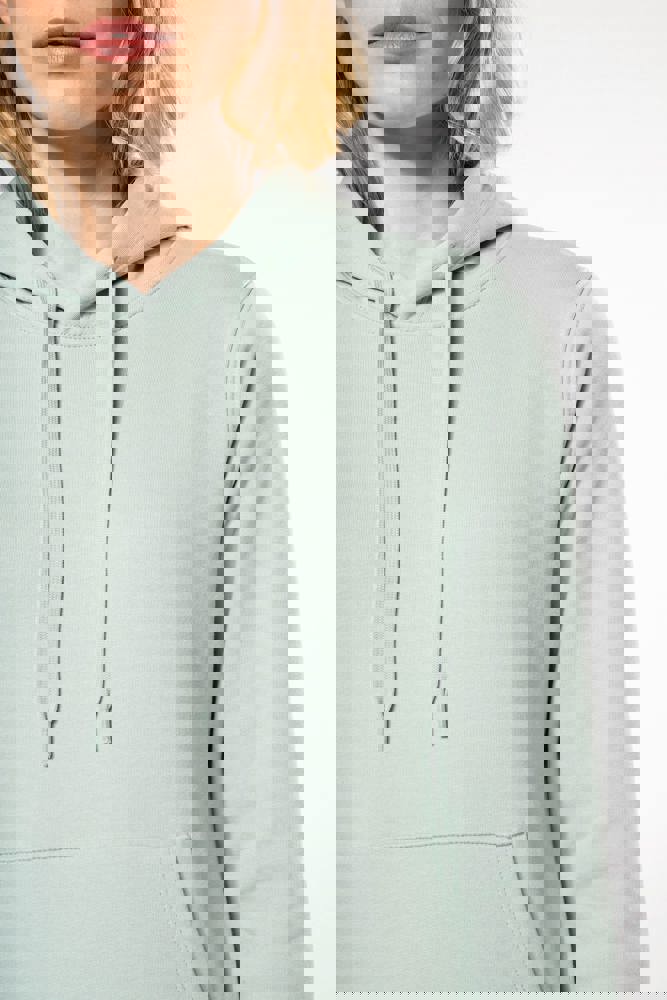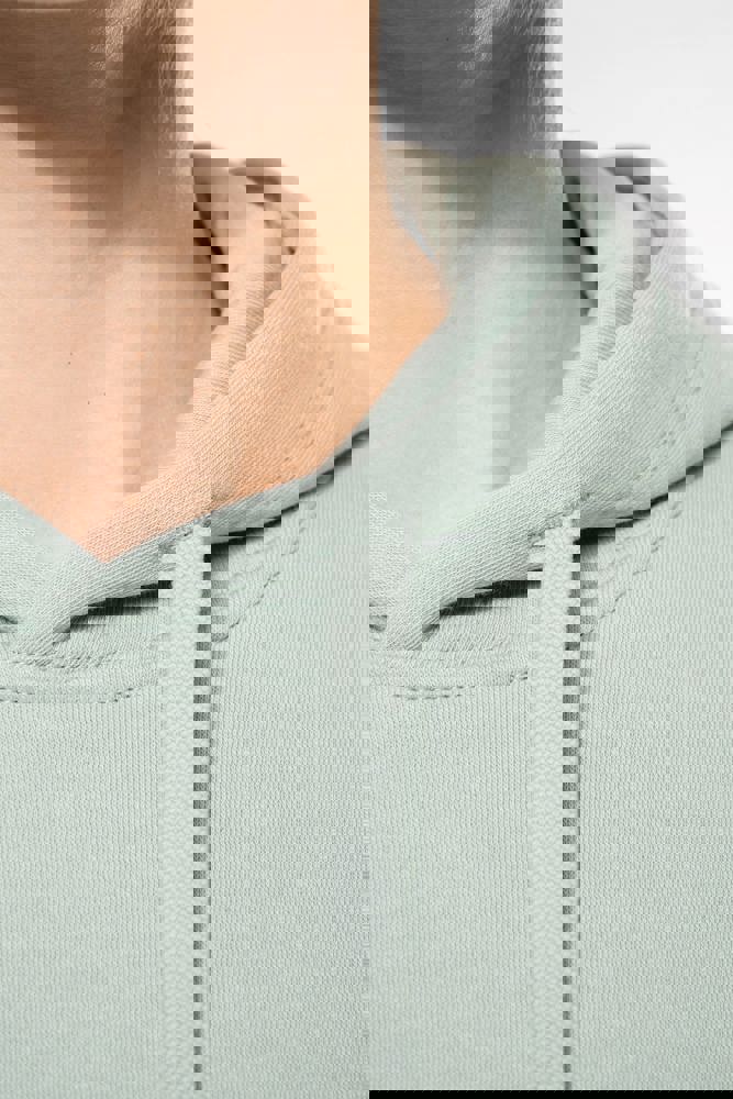 85% katoen / 15% polyester. Gemaakt van 85% biologisch katoen en 15% gerecycled polyester post-consumer. Buitenoppervlak 100% katoen. Geborsteld fleece 3 draden LSF (Low Shrinkage Fleece) aan de binnenkant. Enzymgewassen. Gekamd katoen. Rechte snit. 1x1 ribboord in buisconstructie voor een betere afwerking aan de mouwuiteinden en de onderkant. Kangoeroezak. Gevoerde capuchon 100% katoen, jerseykatoen 180 g. Nektape in toon-op-toon jersey en halvemaanvormige afwerking aan de binnenkant van de kraag. Afwerking met dubbel stiksel aan de mouwuiteinden, de onderkant en de hals. Geen merklabel in de kraag, maar enkel een maatlabel voor eenvoudige personalisatie.