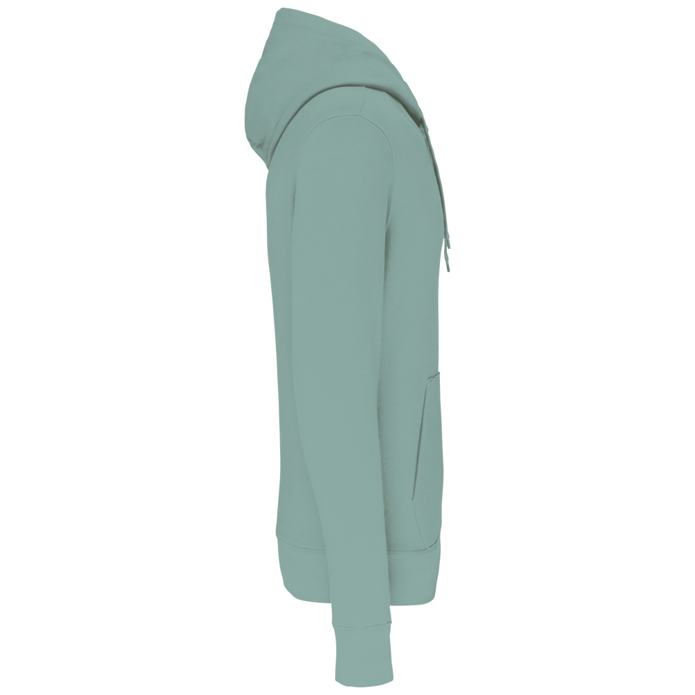 85% katoen / 15% polyester. Gemaakt van 85% biologisch katoen en 15% gerecycled polyester post-consumer. Buitenoppervlak 100% katoen. Geborsteld fleece 3 draden LSF (Low Shrinkage Fleece) aan de binnenkant. Gekamd katoen. Enzymgewassen. Rechte snit. 1x1 ribboord in buisconstructie voor een betere afwerking aan de mouwuiteinden en de onderkant. Kangoeroezak. Gevoerde capuchon 100% katoen, jerseykatoen 180 g. Nektape in toon-op-toon jersey en halvemaanvormige afwerking aan de binnenkant van de kraag. Afwerking met dubbel stiksel aan mouwuiteinden en onderkant. Geen merklabel in de kraag, maar enkel een maatlabel voor eenvoudige personalisatie.