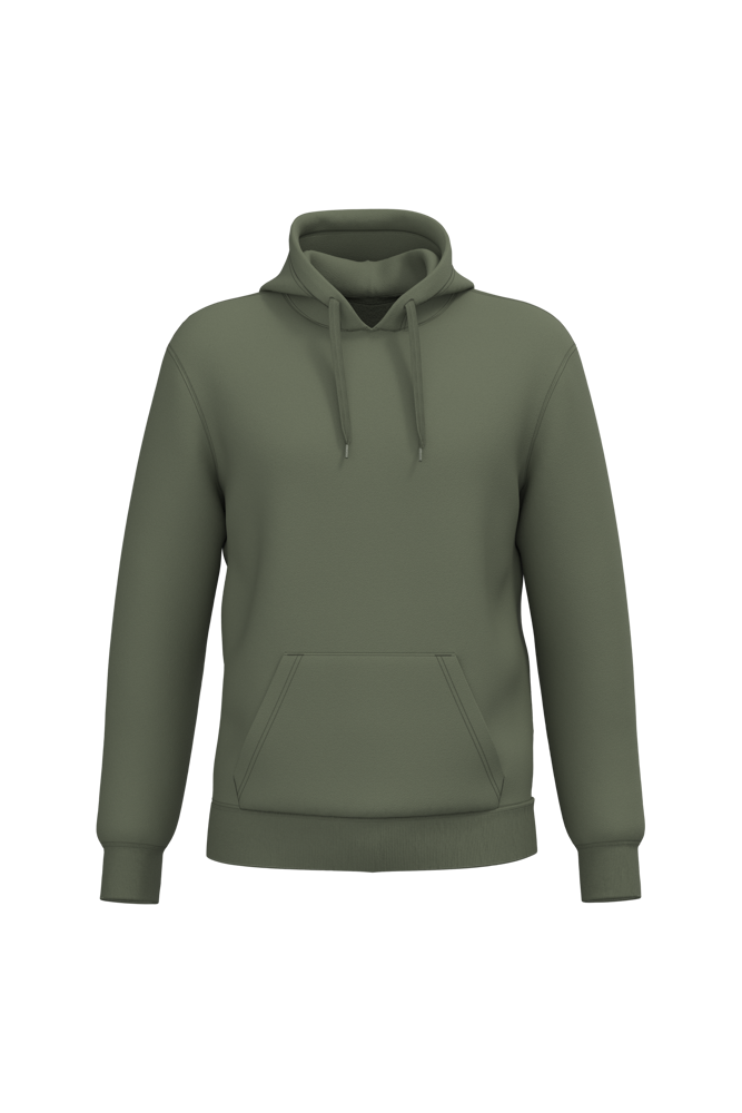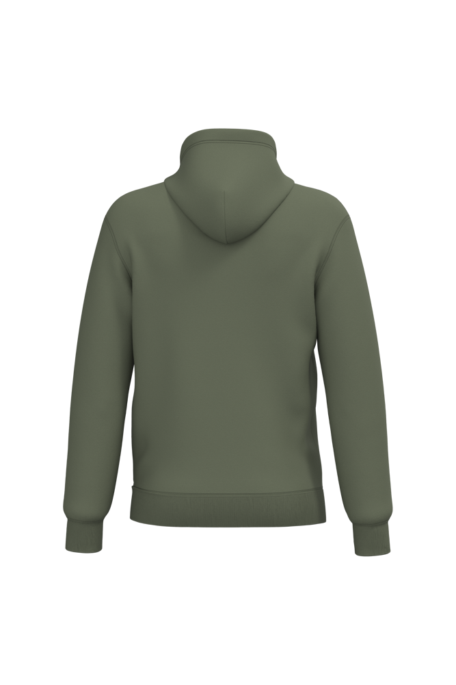 50% ringgesponnen katoen / 50% gerecycled polyester post-consumer. Geborsteld fleece aan de binnenkant. Straight snit. Cut-and-sew-techniek. 2x1 ribboord in buisconstructie voor een betere afwerking aan de hals, de mouwuiteinden en de onderkant. Kangoeroezak. Gevoerde capuchon in jersey-polykatoen met platte aanrijgkoordjes. Ton-sur-ton nektape in jersey in de kraag. Geen merklabel in de kraag, maar enkel een maatlabel voor eenvoudige personalisatie.