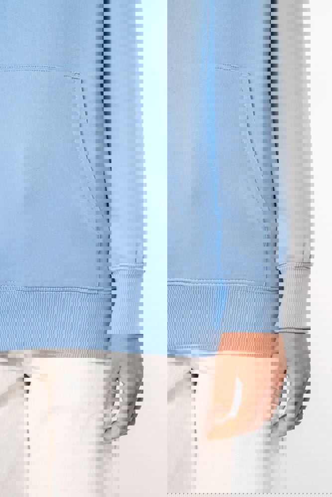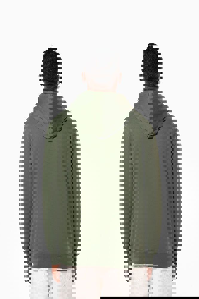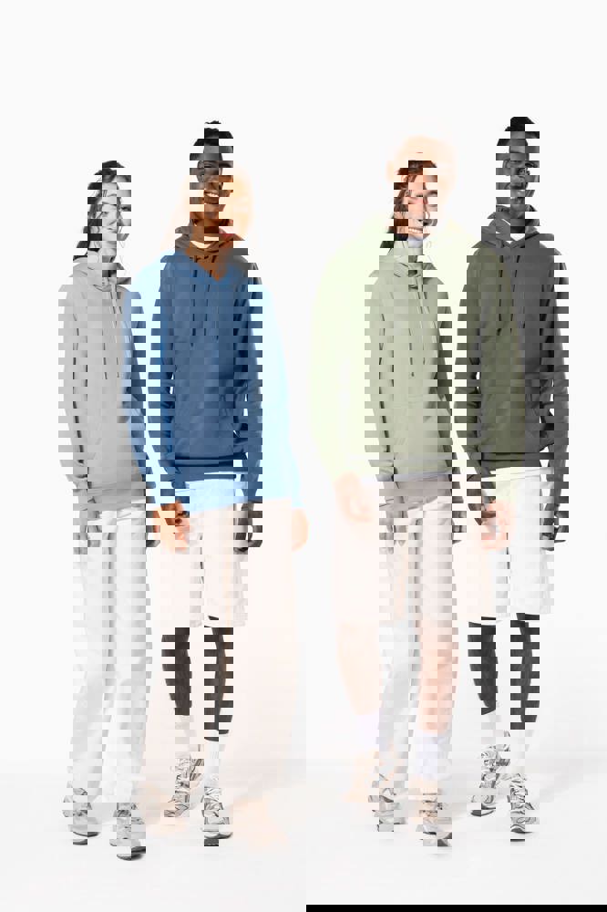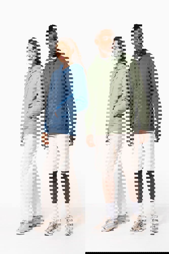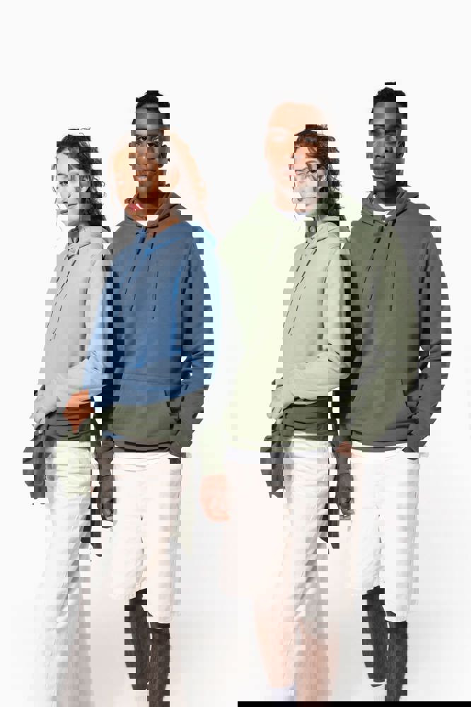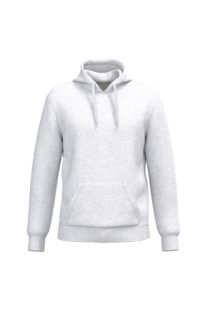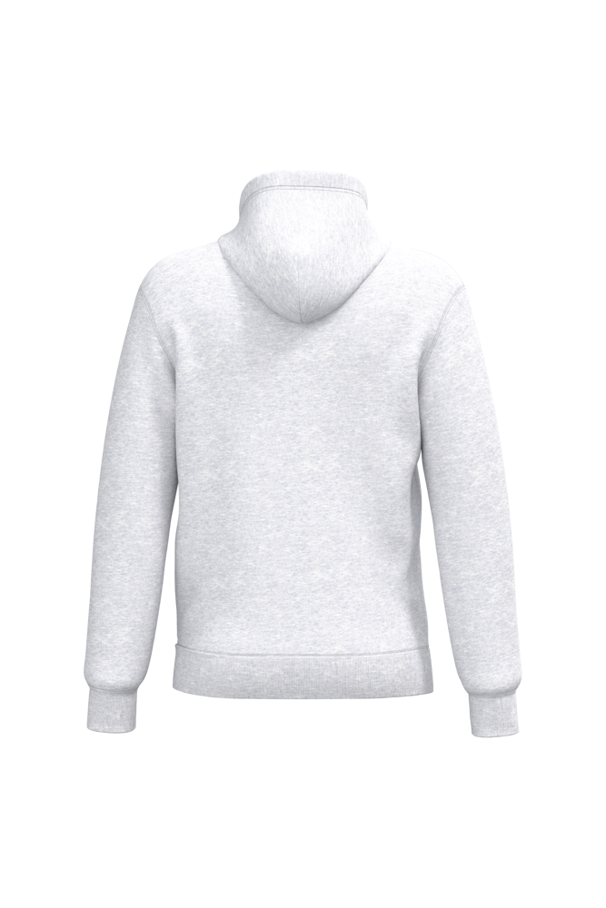 50% ringgesponnen katoen / 50% gerecycled polyester post-consumer. Geborsteld fleece aan de binnenkant. Straight snit. Cut-and-sew-techniek. 2x1 ribboord in buisconstructie voor een betere afwerking aan de hals, de mouwuiteinden en de onderkant. Kangoeroezak. Gevoerde capuchon in jersey-polykatoen met platte aanrijgkoordjes. Ton-sur-ton nektape in jersey in de kraag. Geen merklabel in de kraag, maar enkel een maatlabel voor eenvoudige personalisatie.
