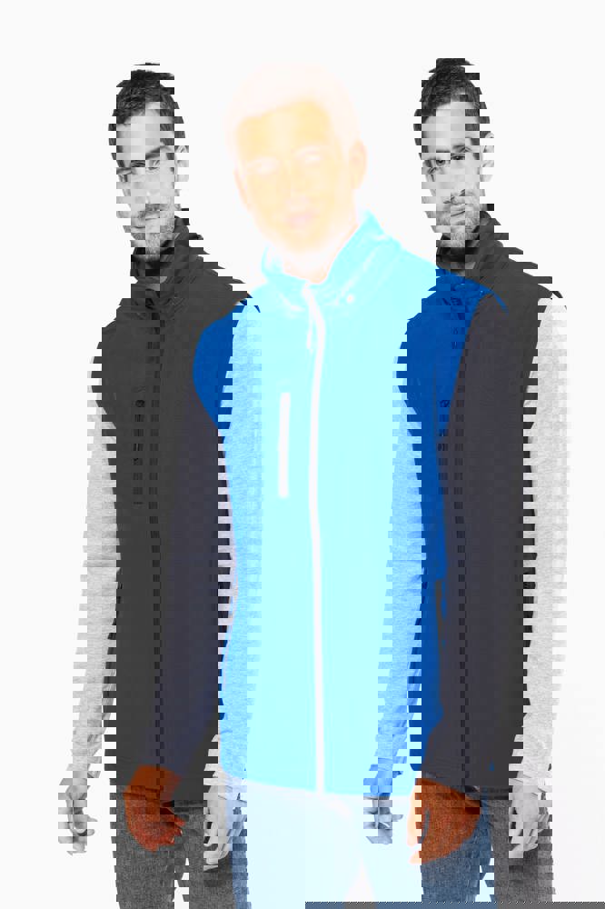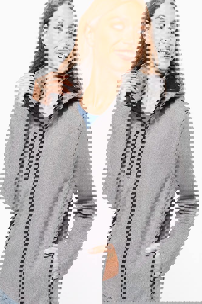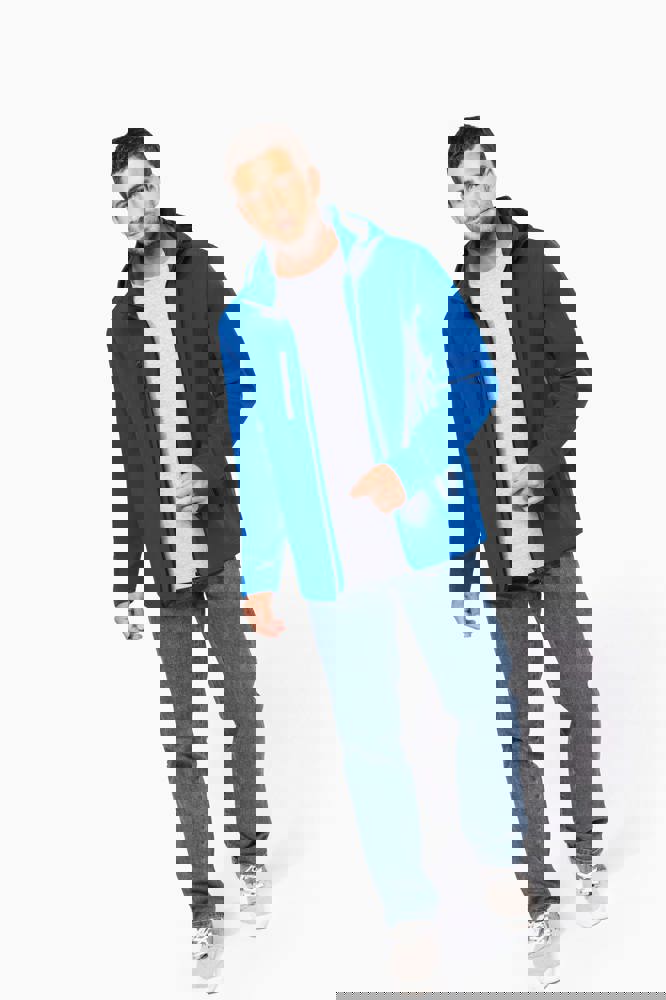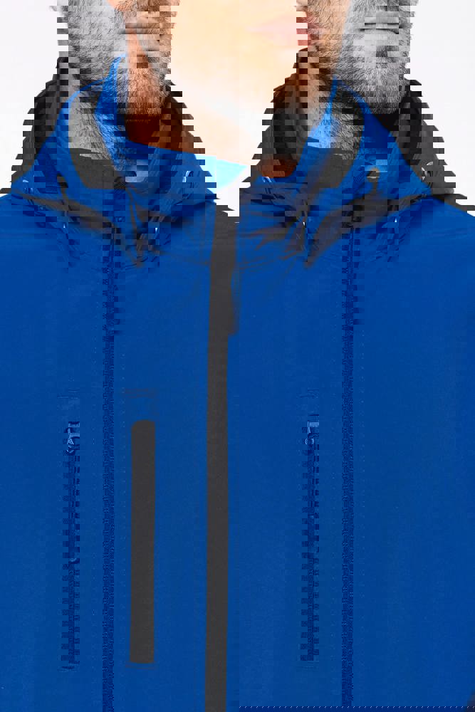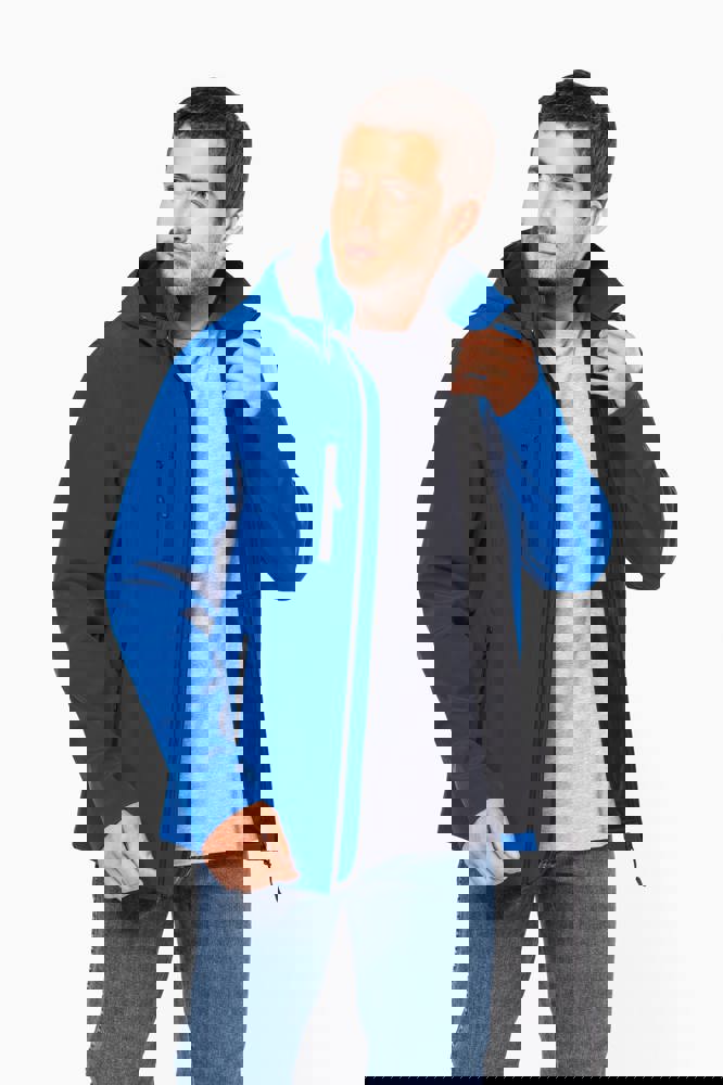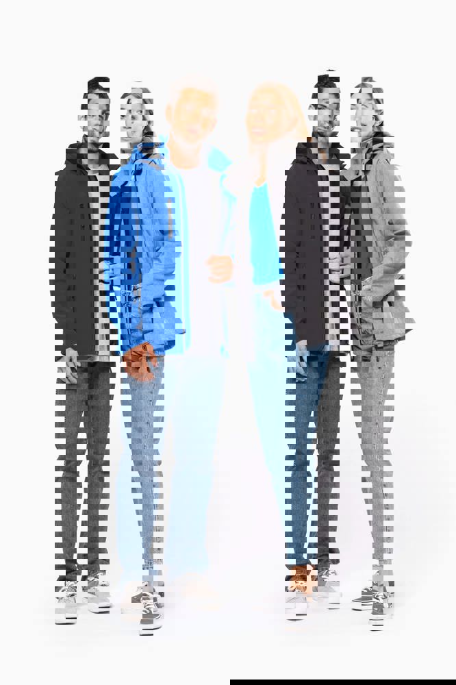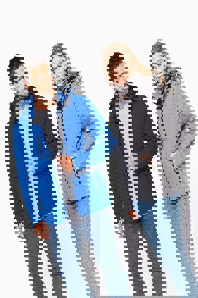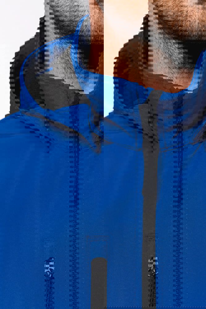 95% polyester / 5% elasthan. 3-laagse ademende stof. 3000 g/m²/24 u en waterdicht 8000 mm. Buitenkant : 95% polyester / 5% elasthan. Tussenlaag : ademend membraan. Binnenlaag : microfleece. Stof om gemakkelijk te bedrukken. Rechte snit. Ritssluiting. 2 ritszakken aan de voorkant en een ritszak op de rechterkant vooraan. Afneembare capuchon met drukknopen en aanrijgkoordjes. De mouwen zijn afneembaar dankzij een rits. Dubbel stiksel aan mouwuiteinden en onderkant.
