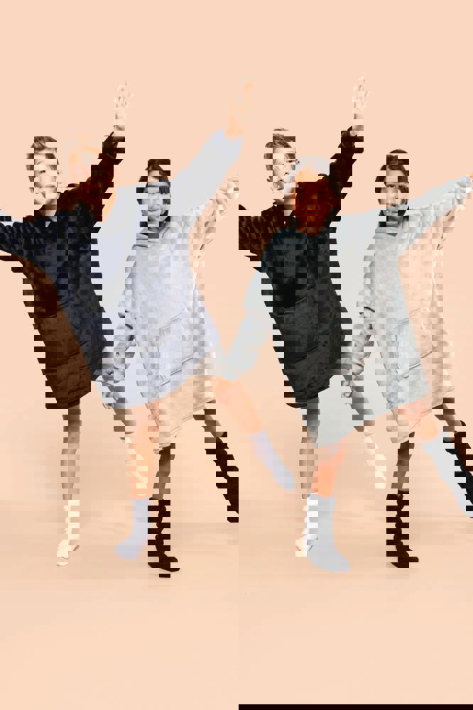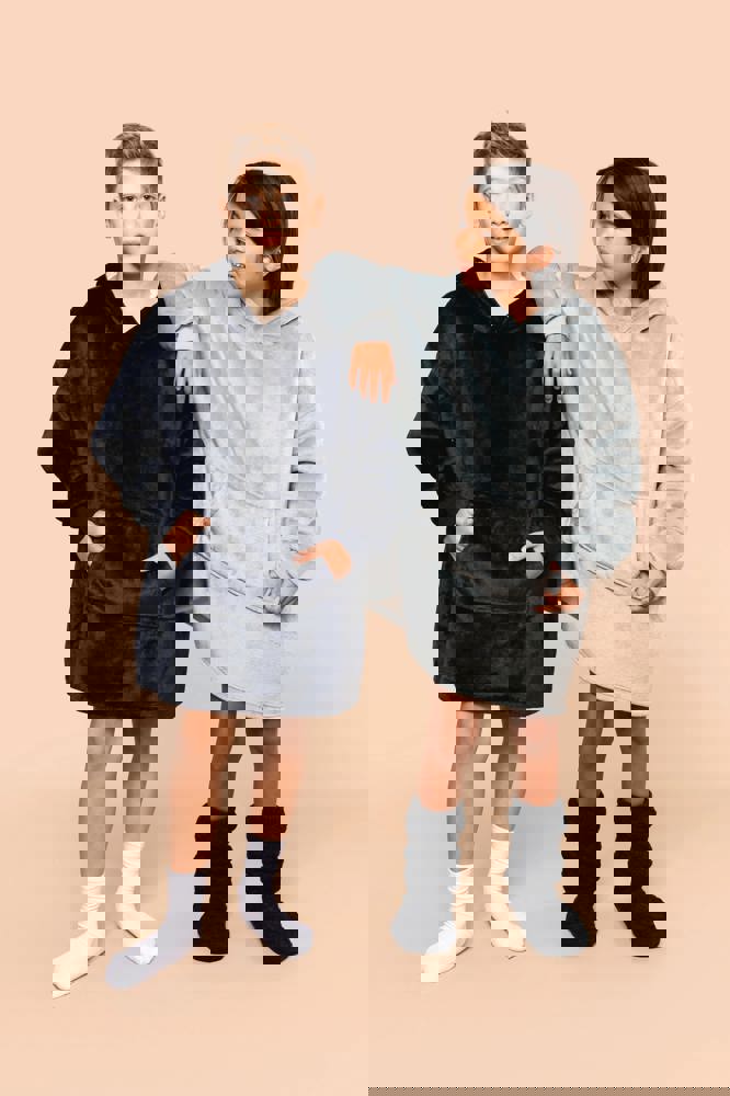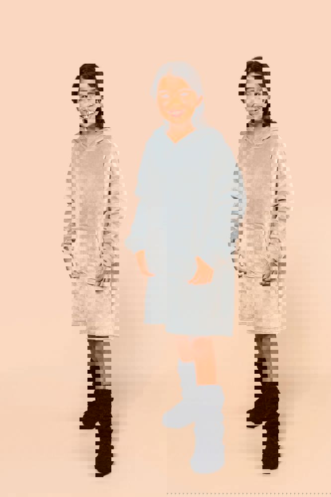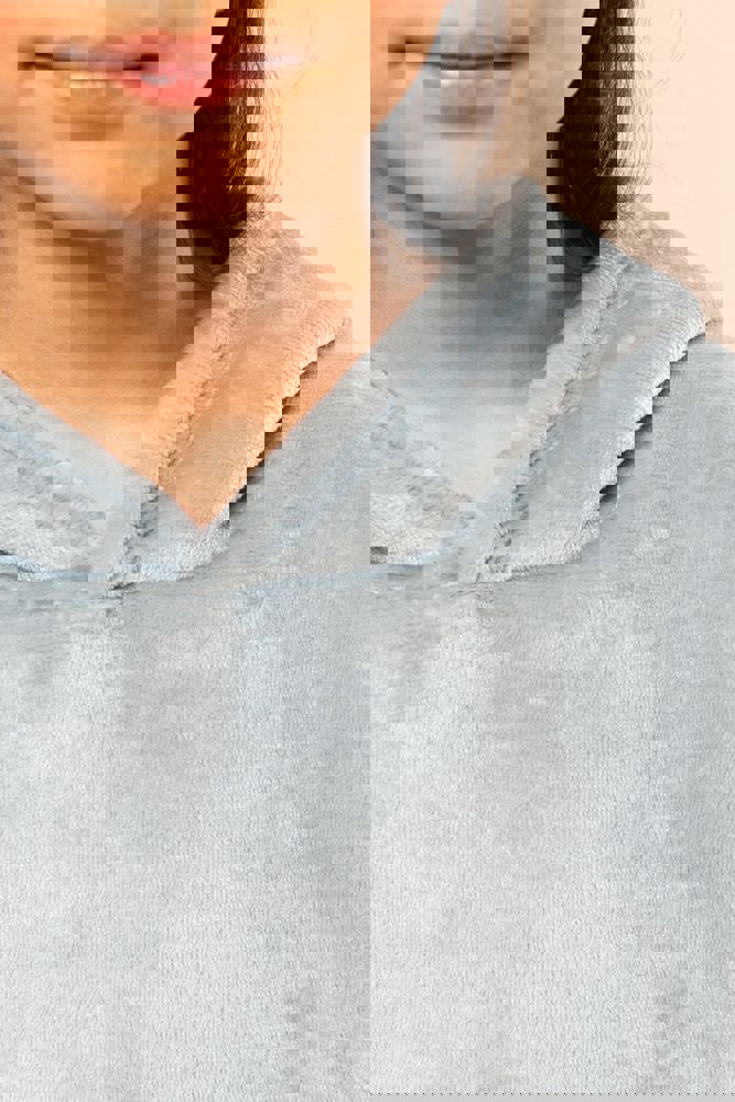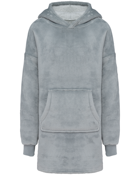 100% polyester. Oversized model met afhangende schouders. Dubbelzijdige stof, buitenzijde van ribfluweel en binnenzijde van sherpa. Vooraan gekruiste capuchon in twee panelen, afgewerkt met dubbel stiksel. Lange mouwen met een mouwuiteinde in 1x1 ribboord, buisvormig voor een betere afwerking. In de ribboord aan de mouwuiteinden zit elasthan om vervorming te voorkomen. Kangoeroezak. De boord onderaan kreeg een dubbel stiksel. Geen merklabel, maar een afscheurbaar maatlabel in de kraag voor eenvoudige personalisatie.