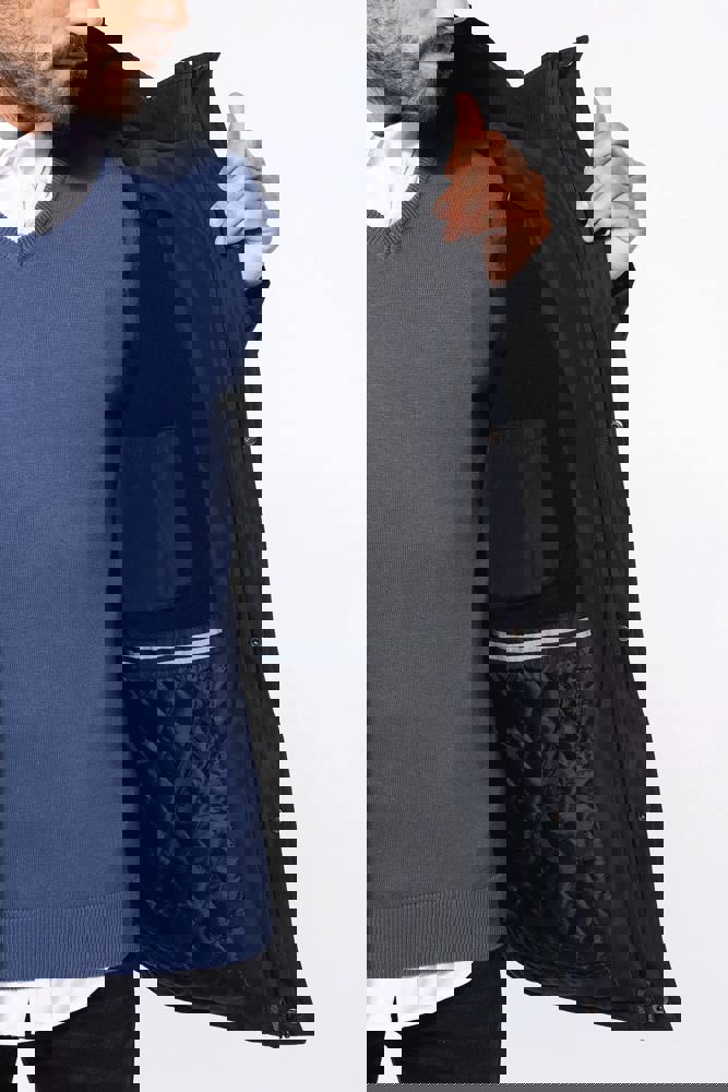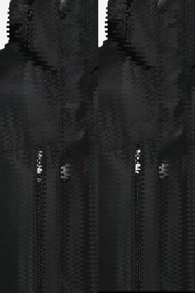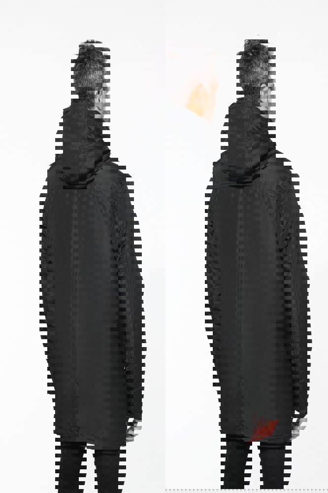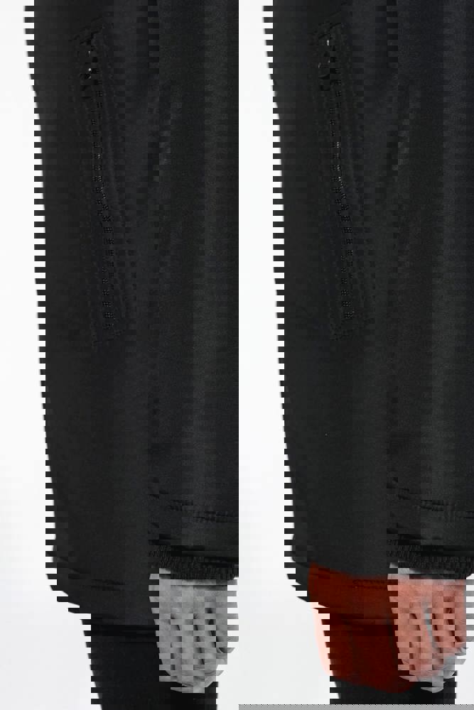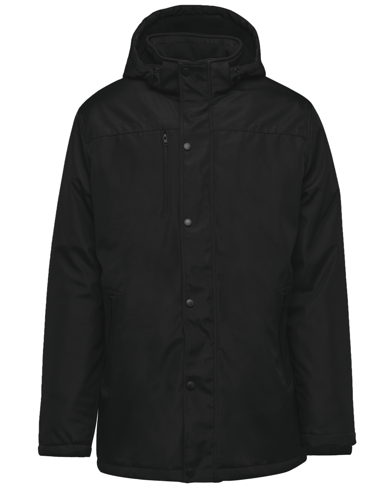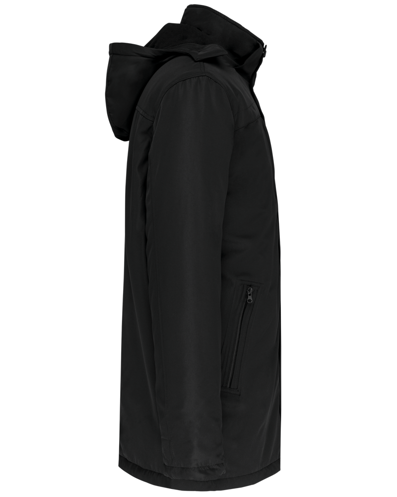 Buitenkant: 100% pongépolyester 230 g/m². Binnenvoering 100% polyester 135 g/m². Binnenkant in twee materialen: microfleece 180 g/m² aan de bovenzijde van de body en gewatteerde voering van polyester 210T 60 g/m² aan de onderzijde. Gesatineerde buitenstof. 2 zakken aan de zijkant en 1 borstzak met rits vooraan. 2 binnenzakken. In ribboord gebreide binnenkraag en afneembare capuchon met fleecevoering. Ritssluiting met dubbele schuiver en stormoverslag. Mouwuiteinden met ribboord aan de binnenkant. Binnenin een tweekleurige fantasiebies. 1 rits aan de linkerkant en 1 drukkersrits.
