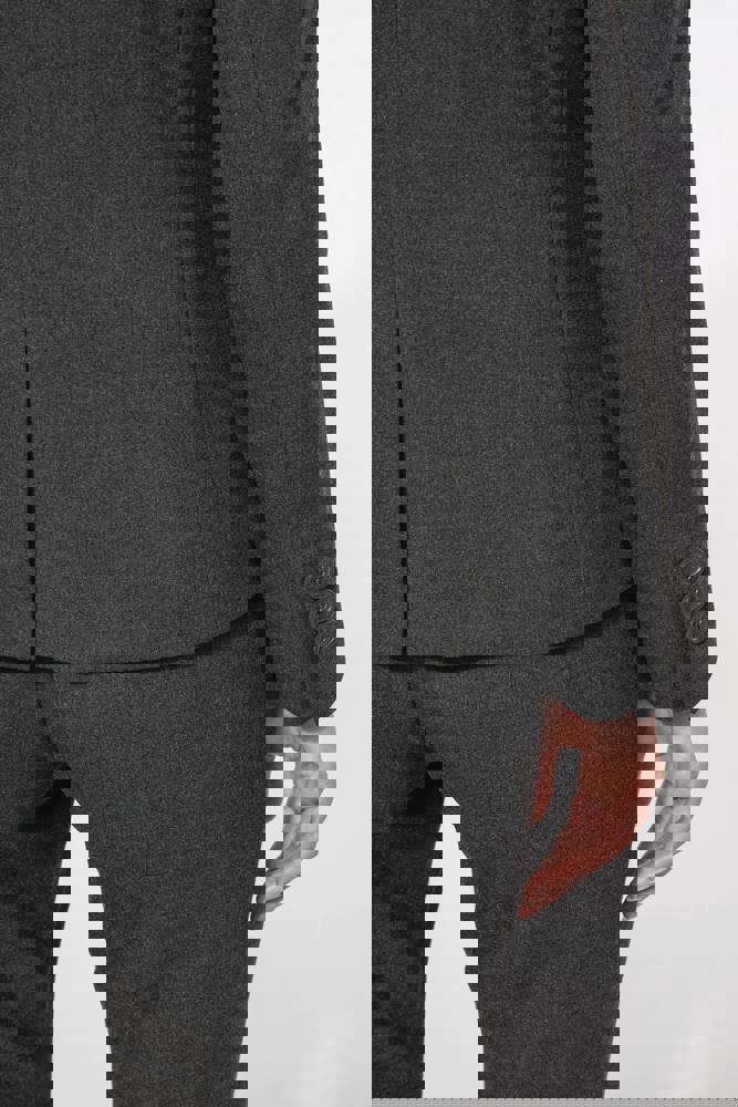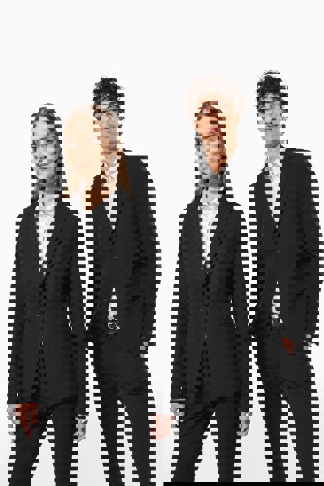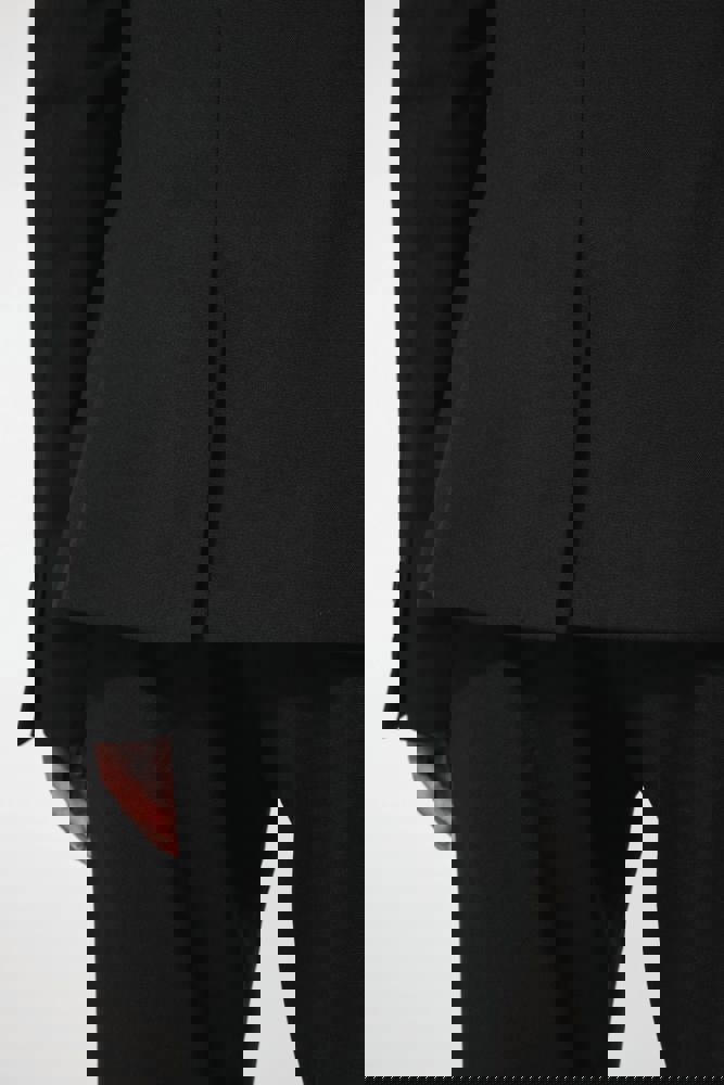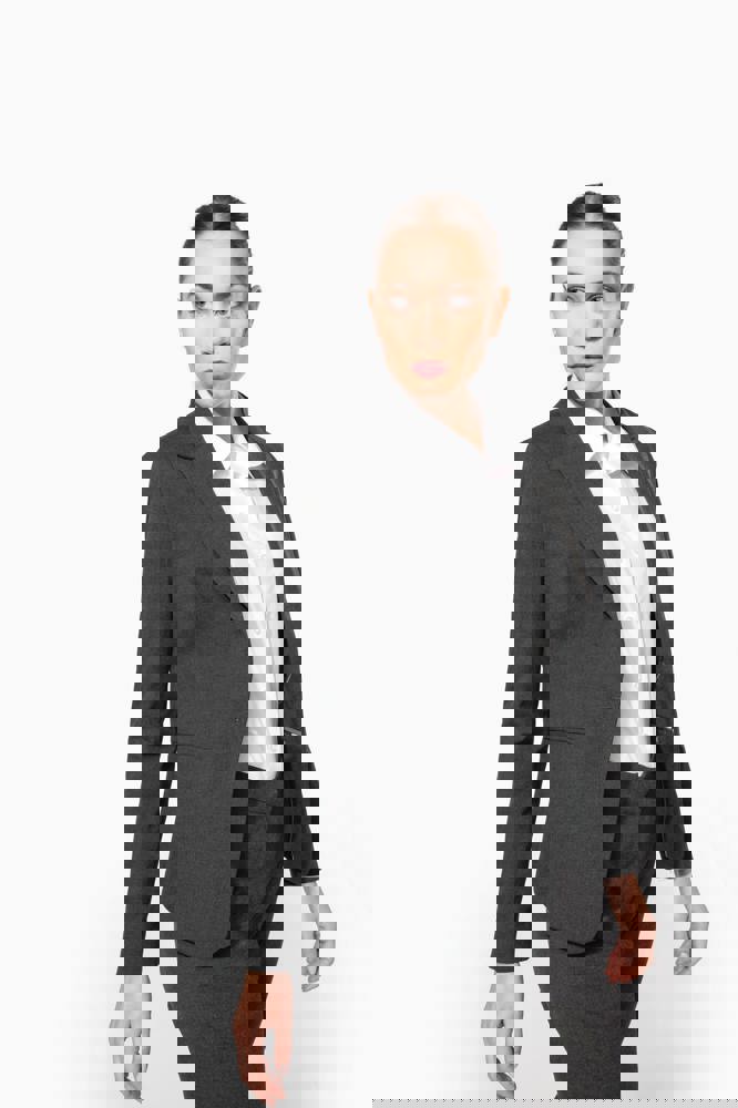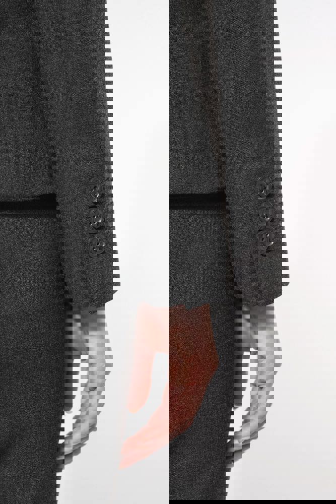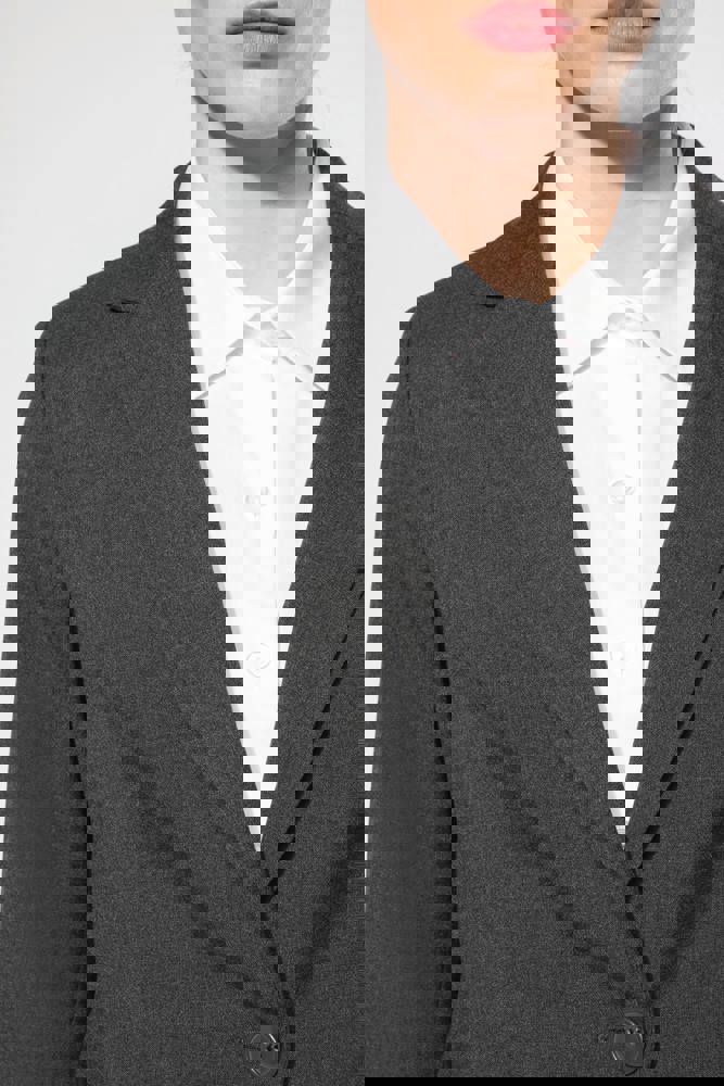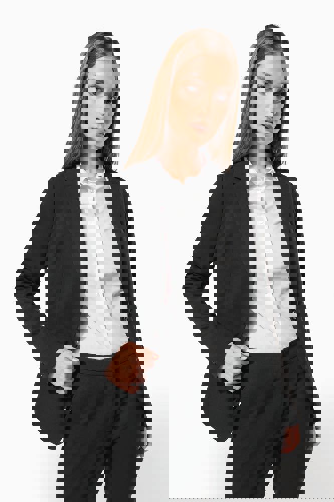 64% polyester / 34% viscose / 2% elasthan. Voering 100% tafpolyester. Jas met 1 knoop. 2 omzoomde zakken aan de voorkant. 2 binnenzakken met knoop. Mouwuiteinde met 3 knopen. 1 ruimtesplit op de achterkant.