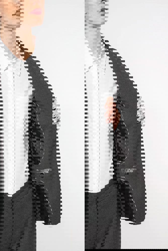 64% polyester / 34% viscose / 2% elasthan. Voering 100% tafpolyester. Jas met 1 knoop. 2 omzoomde...meer