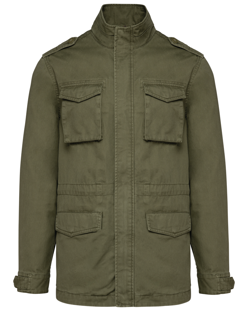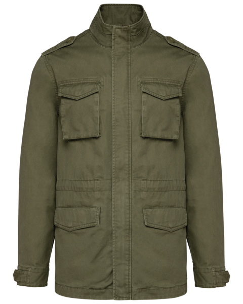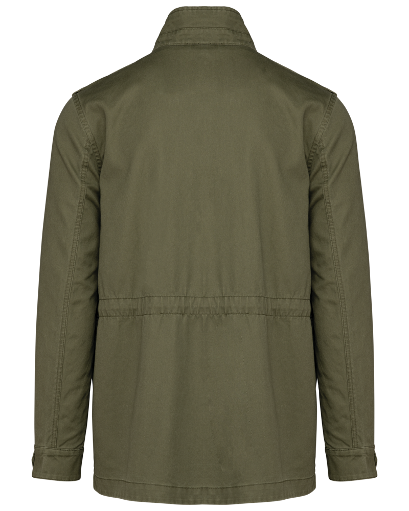 100% katoen. Twillconstructie. Regular fit. Gewassen kledingstuk. Deze techniek maakt dat er kleurverschillen kunnen zijn tussen de producten en elk stuk dus uniek is. Ritssluiting met een metalen schuiver en trekker in de hoofdstof, en een knooplijst met onzichtbare drukknopen in het midden vooraan. Binnenin afgewerkt met een oplegsel. Vier buitenzakken met een drukknoop. Pols met een sierlijst, samengehouden met een drukknoop. Verstelbare aanrijgkoordjes in de tailleband, met stopper met lederlook in het kledingstuk. Schouderlijst met knoop. Binnenzak met klittenband. Halve maan voor eenvoudige personalisatie en ophanglus binnenin.