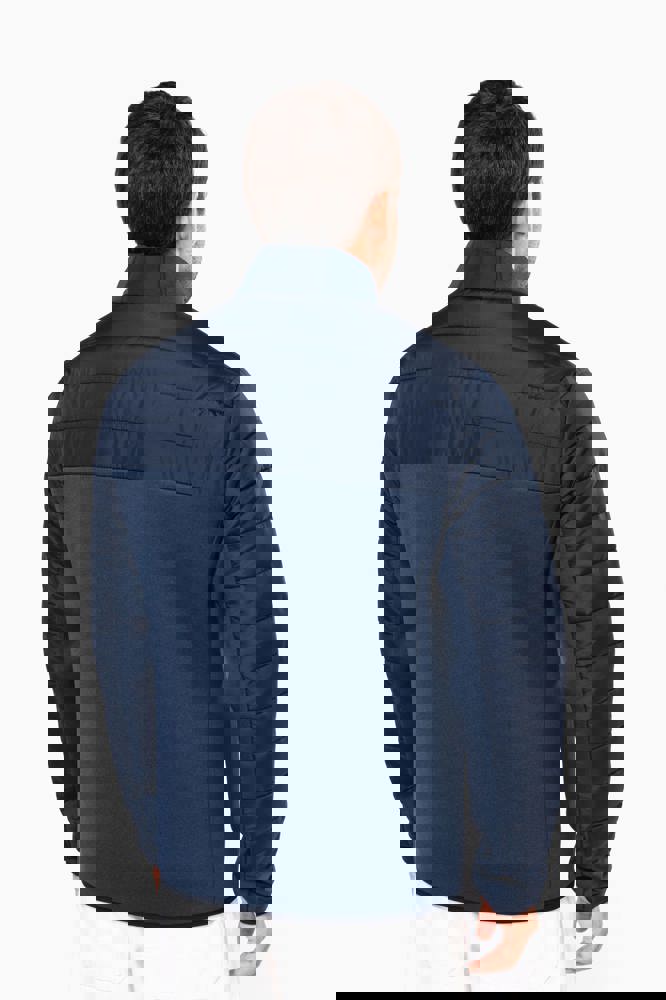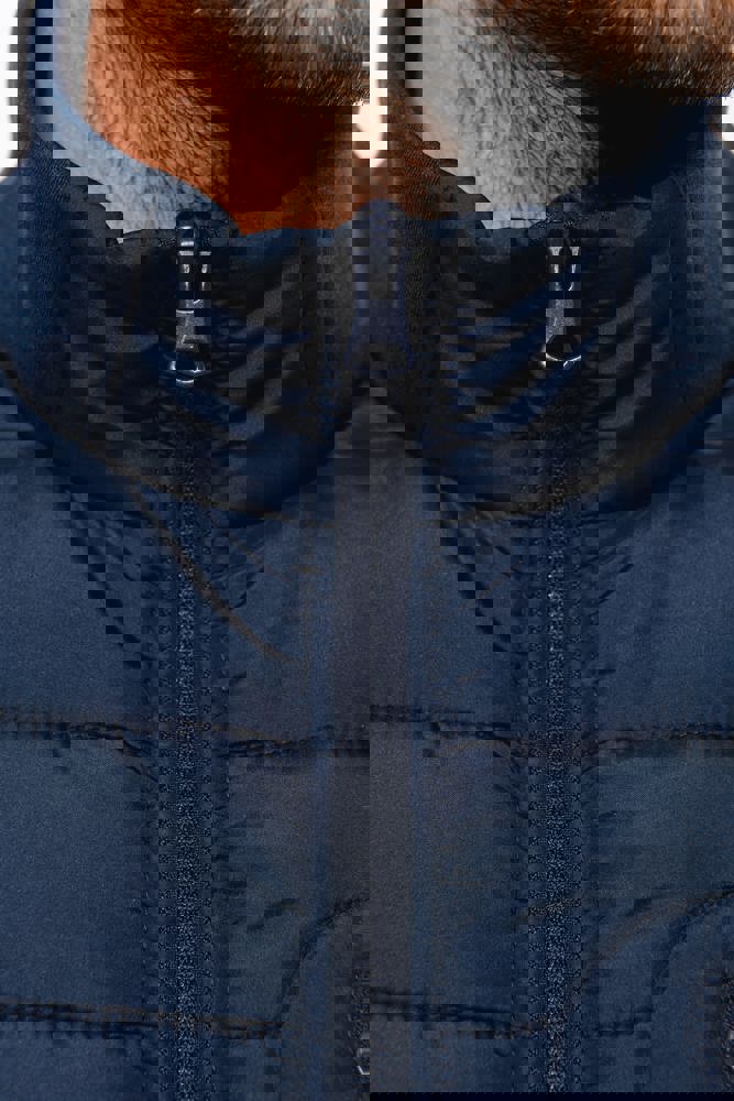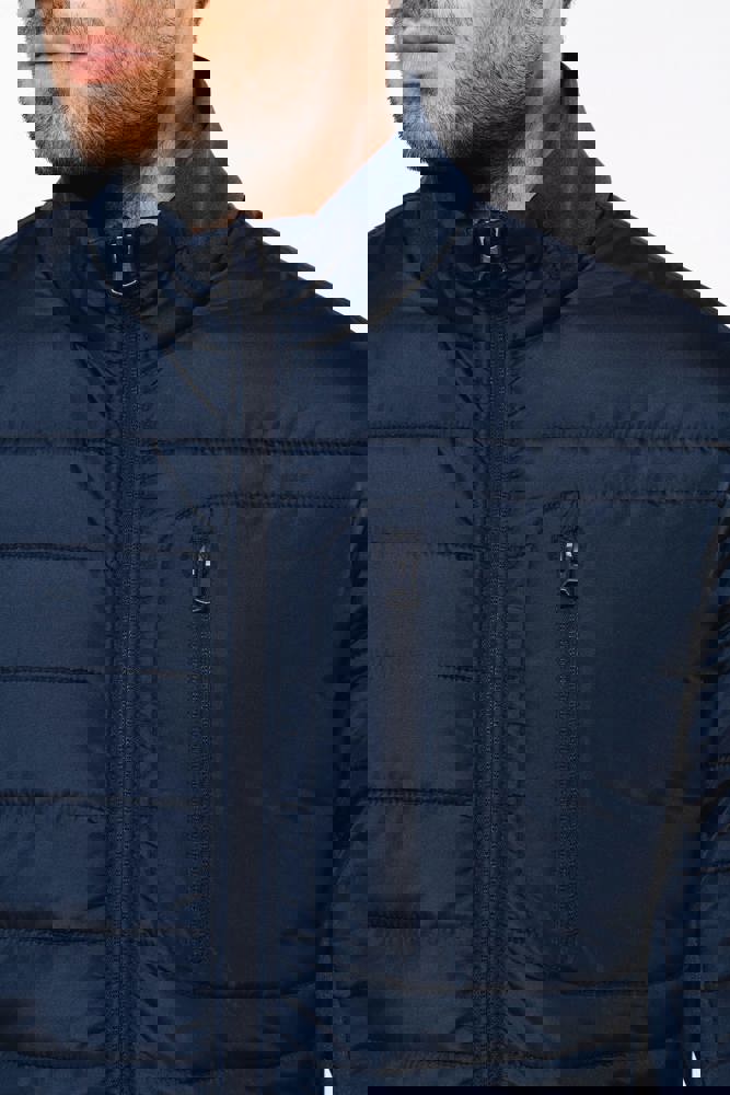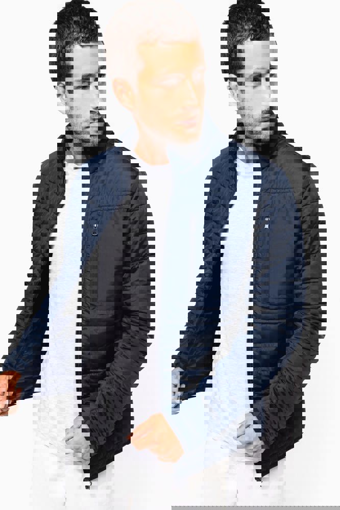 Stof van zijkanten, achterkant, onderkant mouwen en deel van de hals: 94% polyester / 6% elasthan. Stof van bovenkant mouwen, voorzijde en achterkant: 100% pongépolyester 300T met polyurethaancoating. Vulling van 100% polyester 120 g. Voering van 100% gerecycleerd tafpolyester 230T. Body vooraan en een derde van de achterkant gewatteerd. Sluit vooraan met een omgekeerde nylon rits. 2 omzoomde zijzakken aan de voorkant. Opgezette borstzak met omgekeerde rits. Kraag met inzetsels in twee stoffen. Elastische bies aan de mouwuiteinden en onderaan.
