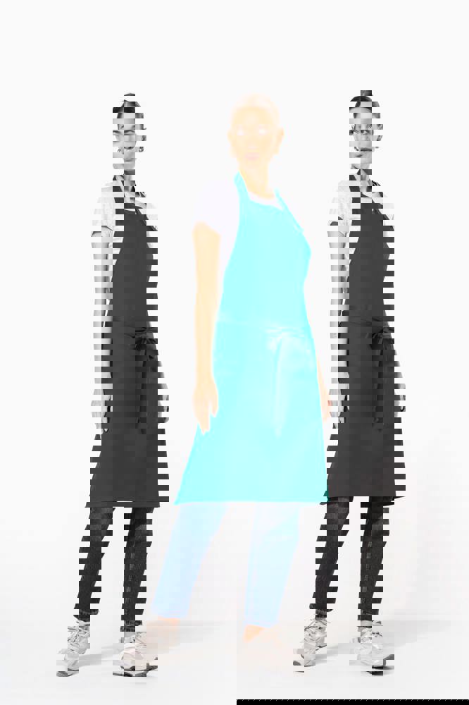 65% polyester / 35% katoen (Denim, Black Denim 65 % katoen / 35 % polyester). Thuis wassen op 60 °C. Metalen gesp aan de hals om de schort in lengte aan te passen. Zonder zak. Afmetingen: H 90 cm - B 76 cm.