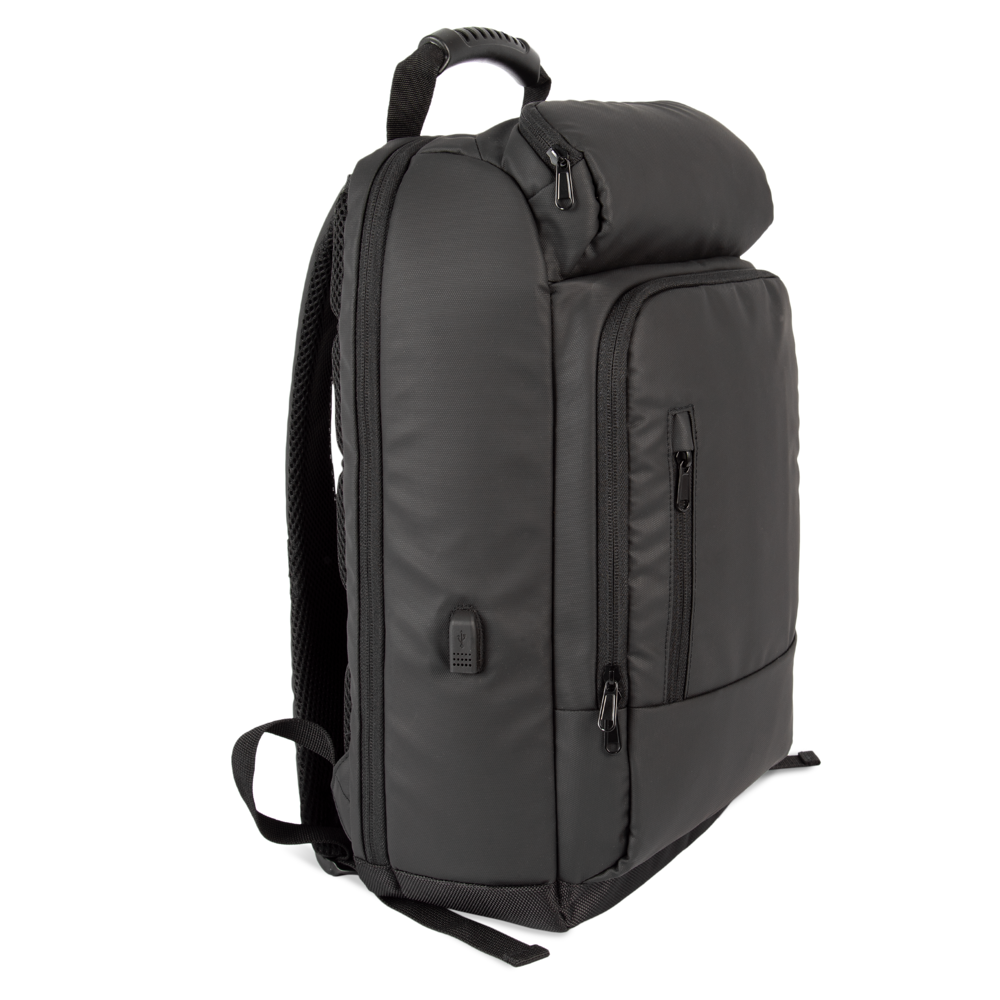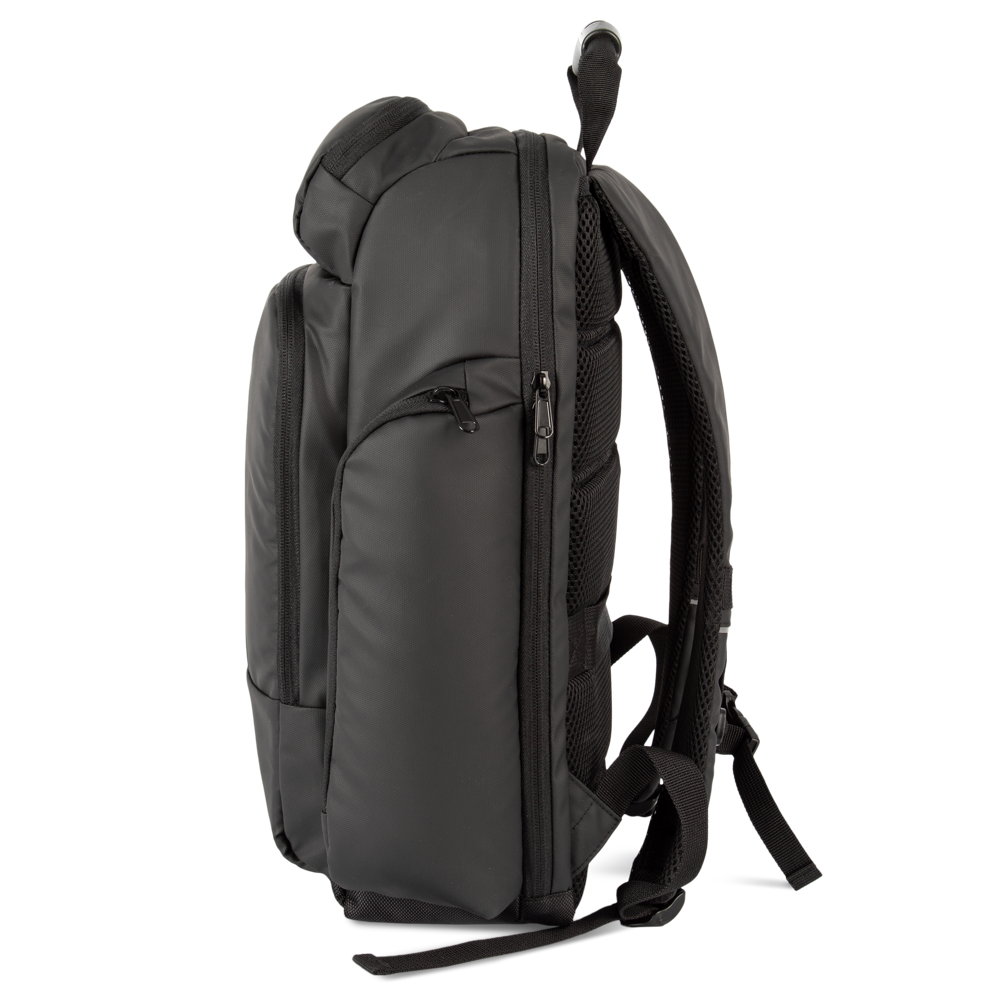 100% polyester. Werkrugzak met een laptopvak (max. 15 inch), een gewatteerd tabletvak en veel ruimte voor documenten. Het hoofdvak kreeg twee meshzakken, een grote ritszak en twee zijzakken voor de powerbank. Externe type C-connector met interne kabel voor de powerbank. Zijzak met voering van aluminium aan de buitenkant, om drinkbussen koel te houden (max. 50 cl). Groot voorste vak met organizer en buitenzak met rits. Zeer stevige, contrasterende bodem in 1680D met bescherming tegen schuring. Grote gewatteerde zak bovenaan, voor spulletjes of een zonnebril. Gewatteerde en ademende achterkant en schouderriemen. Klittenbandriem op de achterkant om de rugzak te bevestigen aan de handgreep van een trolley.