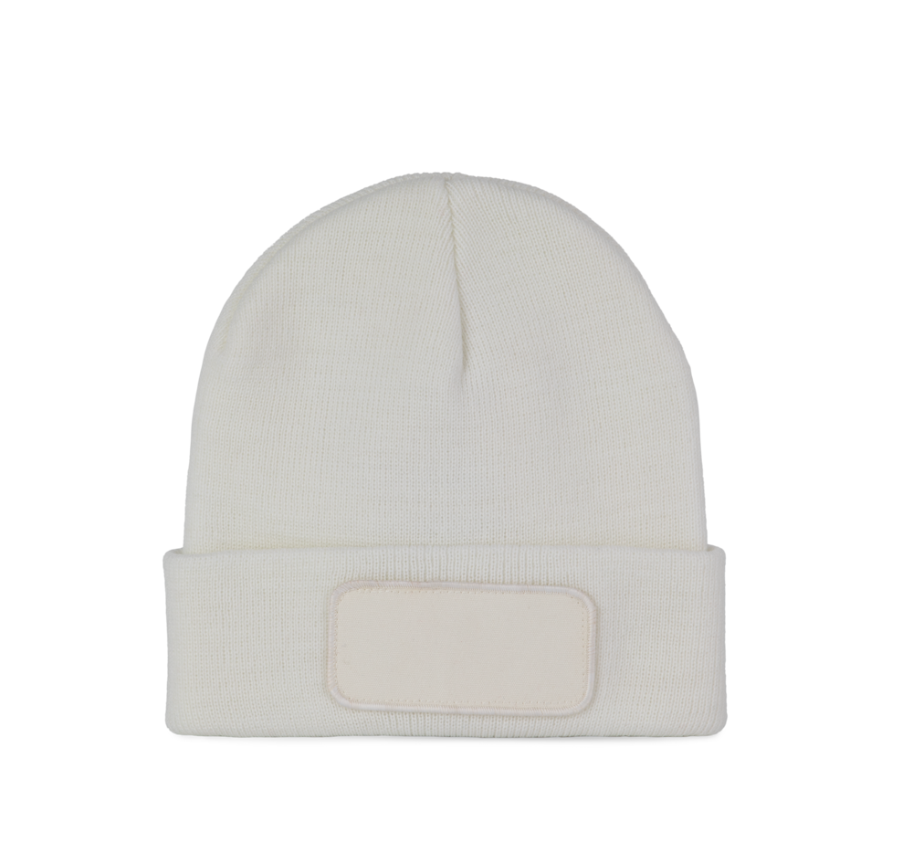 50% gerecycled polyester, 50% acryl. Muts met gebreide omslag in acryl en polyester. Katoenen patch aan de voorkant, voor eenvoudige personalisatie. Tear-away merklabel.