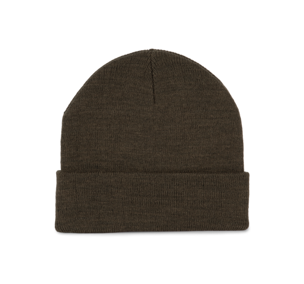50% polyester, 50% acryl. Muts met gebreide omslag, gemaakt van gerecycleerd polyester en acryl. Tear-away merklabel.