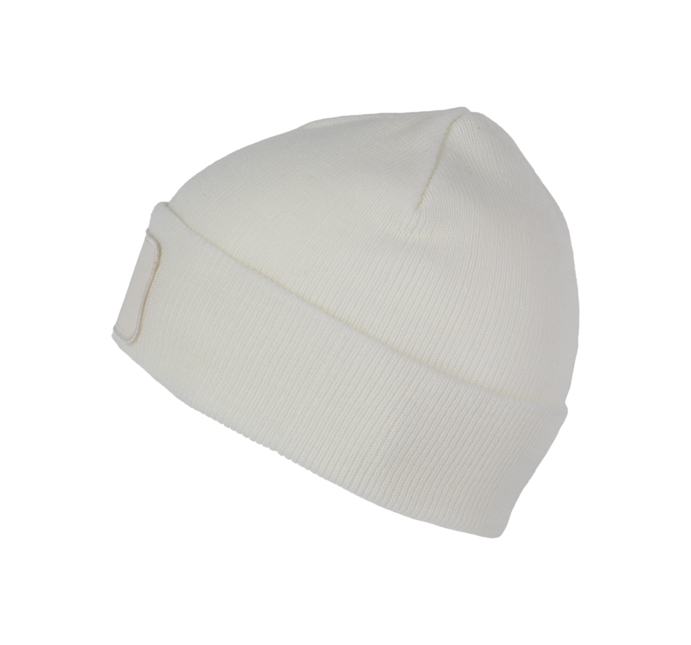 100% acryl. Gebreide muts met omslag in zacht acryl. Katoenen patch aan de voorkant, voor eenvoudige personalisatie. Tear-away merklabel.