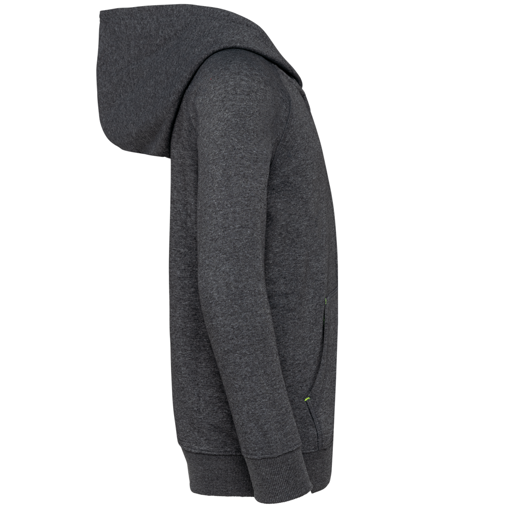 65% polyester / 35% katoen. Geborsteld fleece aan de binnenkant. Gekamd katoen. Vortex-garen. Rechte snit. Raglanmouwen. Nylon ritssluiting. Capuchon gevoerd met toon op toon mesh. Nektape aan de binnenkant van de capuchon en stoppunten in fluokleurtjes op de zakken. Kangoeroezakken met 1 fluorescerend gsm-zakje. Mouwboorden en onderzijde in 2x2 ribboord met dubbele dikte. Halvemaanvormige halsopening op de achterkant, voor eenvoudige personalisatie van het merk aan de binnenkant. Tear-away merklabel.