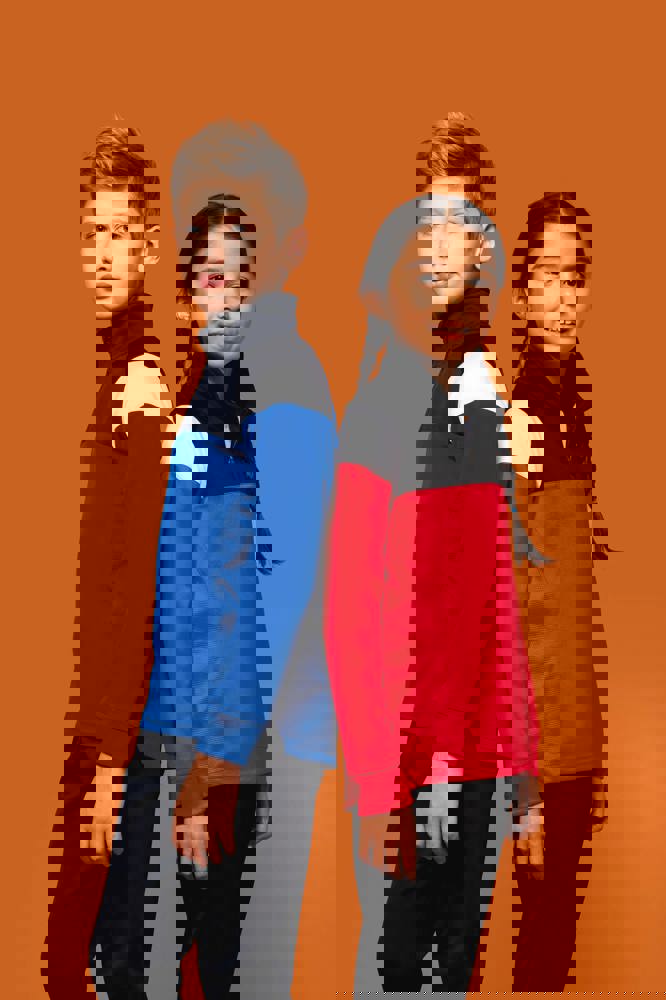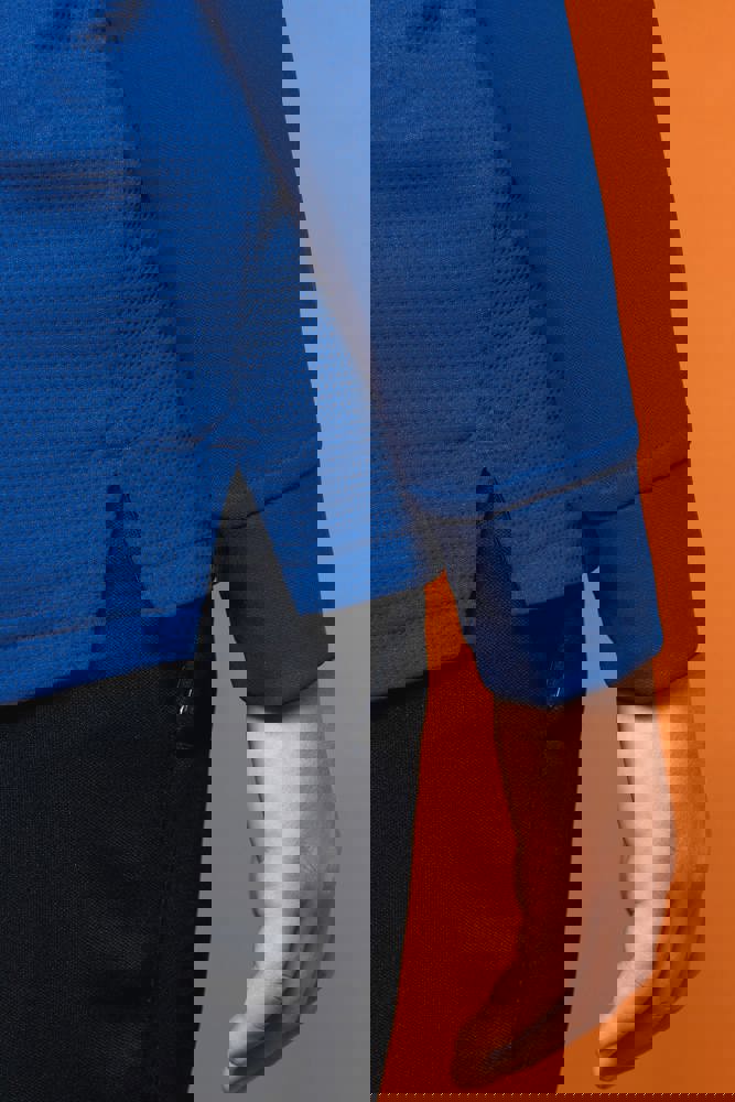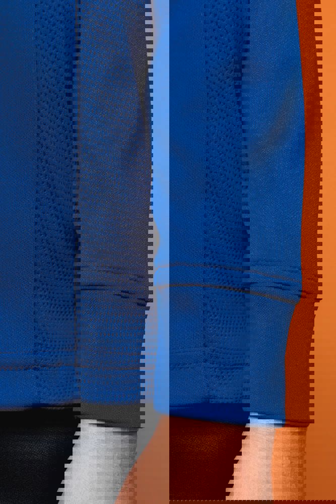 100% mat interlockpolyester. Rechte snit. Kraag met een omgekeerde ton-sur-ton nylonrits. Raglanmouwen met contrasterende inzetsels aan de schouder. Contrasterend inzetsel aan schouder en borst. Inzetstukken in textuurstof opzij en achteraan. Zoom onderaan. Verlengd achterpand en zijsplitten voor meer bewegingsvrijheid. Ritsafdekking boven aan de kraag, voor meer comfort. Afneembaar merklabel voor eenvoudige personalisatie.