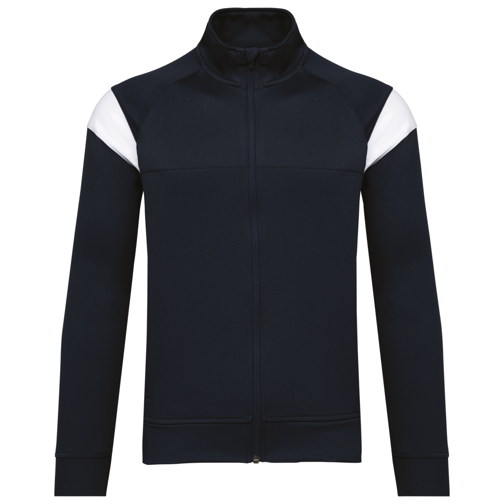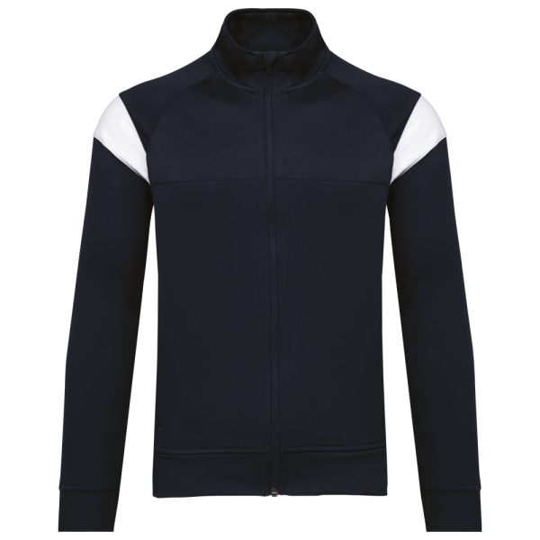 100% mat interlockpolyester. Rechte snit. Sluit vooraan met een omgekeerde ton-sur-ton nylonrits. Raglanmouwen met contrasterende inzetsels aan de schouder. Contrasterend inzetsel aan schouder en borst. Aangezette boord in de hoofdstof aan de mouwuiteinden en de onderkant. 2 ritszakken aan de voorkant. Inzetstukken in textuurstof opzij en achteraan. Ritsafdekking boven aan de kraag, voor meer comfort. Afneembaar merklabel voor eenvoudige personalisatie.
