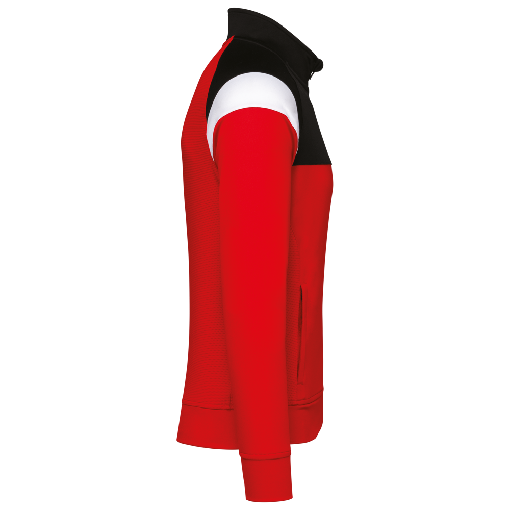100% mat interlockpolyester. Rechte snit. Sluit vooraan met een omgekeerde ton-sur-ton nylonrits. Raglanmouwen met contrasterende inzetsels aan de schouder. Contrasterend inzetsel aan schouder en borst. Aangezette boord in de hoofdstof aan de mouwuiteinden en de onderkant. 2 ritszakken aan de voorkant. Inzetstukken in textuurstof opzij en achteraan. Ritsafdekking boven aan de kraag, voor meer comfort. Afneembaar merklabel voor eenvoudige personalisatie.