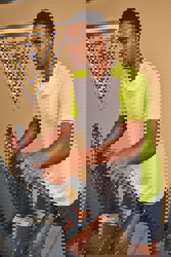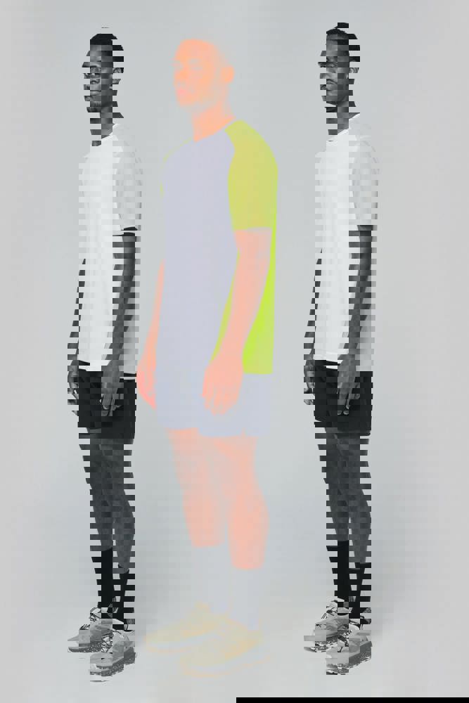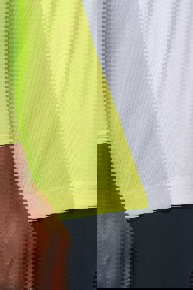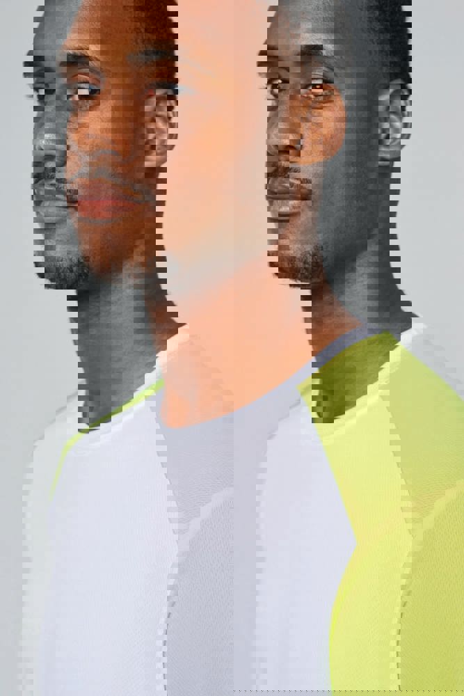 100% post-consumer gerecycled birdseye-polyester. Lichte, sneldrogende stof. Rechte snit. Ronde hals met nektape. Ingezette mouwen. Contrasterende uitsnijdingen op schouders, mouwen en paneel met biesje voor- en achteraan. Dubbel stiksel op mouwuiteinden en boord onderaan. Afneembaar merklabel.