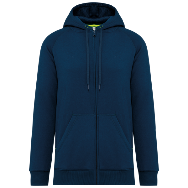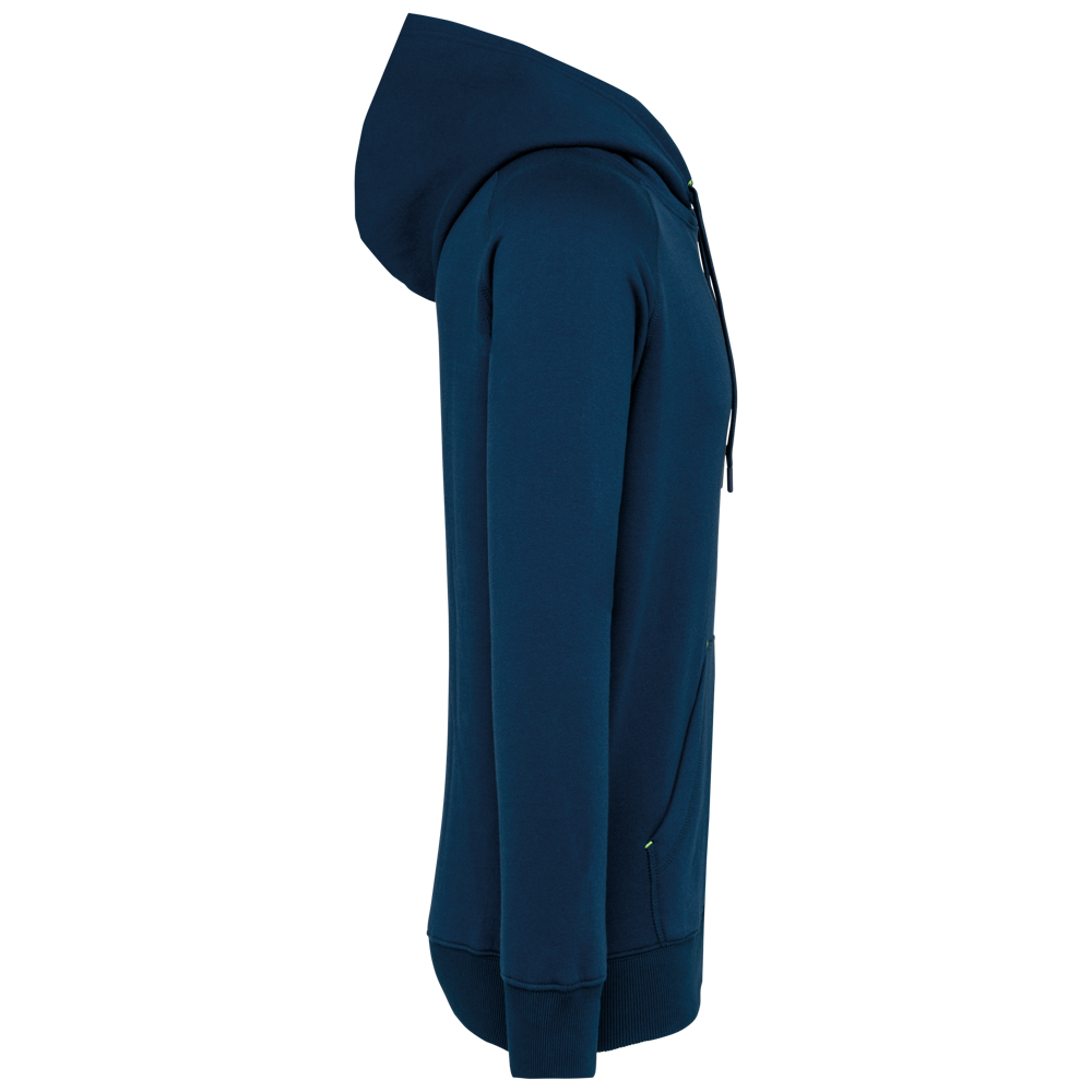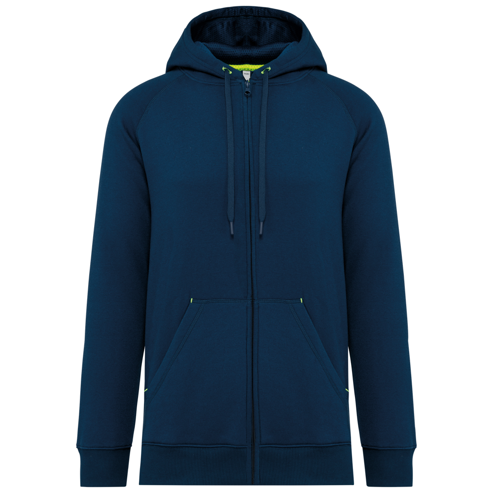 65% polyester / 35% katoen. Vortex-garen. Geborsteld fleece aan de binnenkant. Gekamd katoen. Rechte snit. Raglanmouwen. Nylon ritssluiting. Capuchon gevoerd met toon op toon mesh. Kangoeroezakken met 1 fluorescerend gsm-zakje. Nektape aan de binnenkant van de capuchon, ringetjes voor de koordjes van de capuchon en stoppunten in fluokleurtjes op de zakken. Mouwboorden en onderzijde in 2x2 ribboord met dubbele dikte. Halvemaanvormige halsopening op de achterkant, voor eenvoudige personalisatie van het merk aan de binnenkant. Tear-away merklabel.