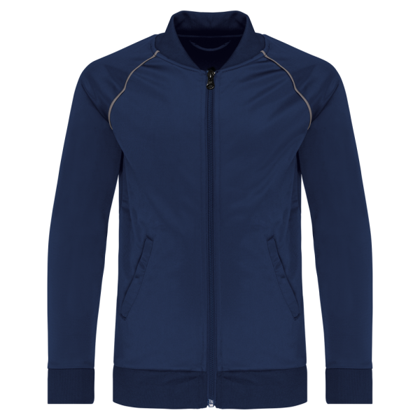 100% tricotpolyester. Rechte snit. Toon op toon ritssluiting in nylon. Raglanmouwen met contrasterend biesje. 1x1 ribboord aan kraag, mouwuiteinden en onderkant. 2 ritszakken aan de zijkant. Afscheurbaar merklabel voor eenvoudige personalisatie.