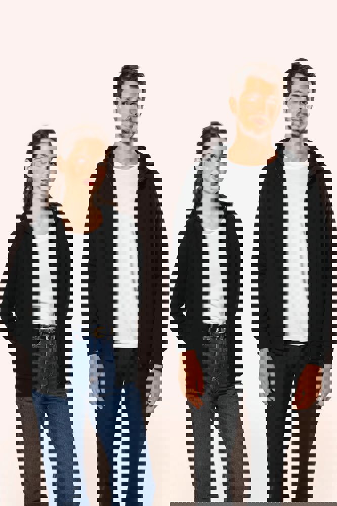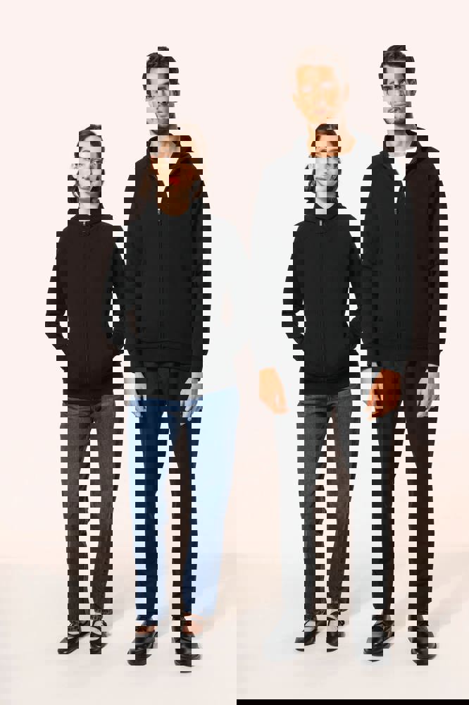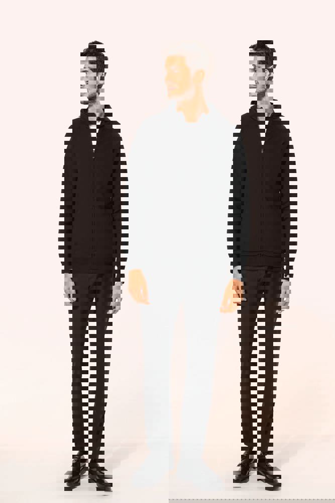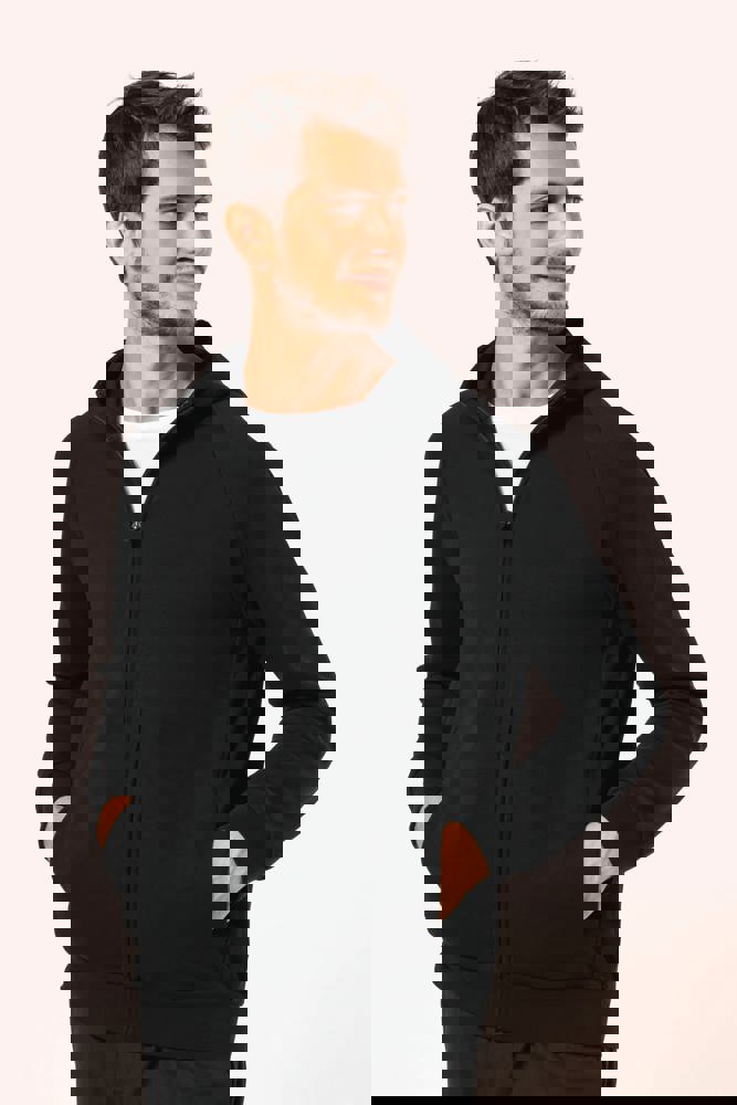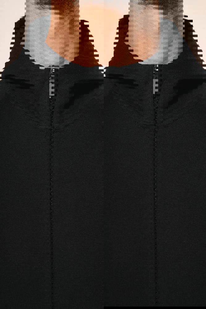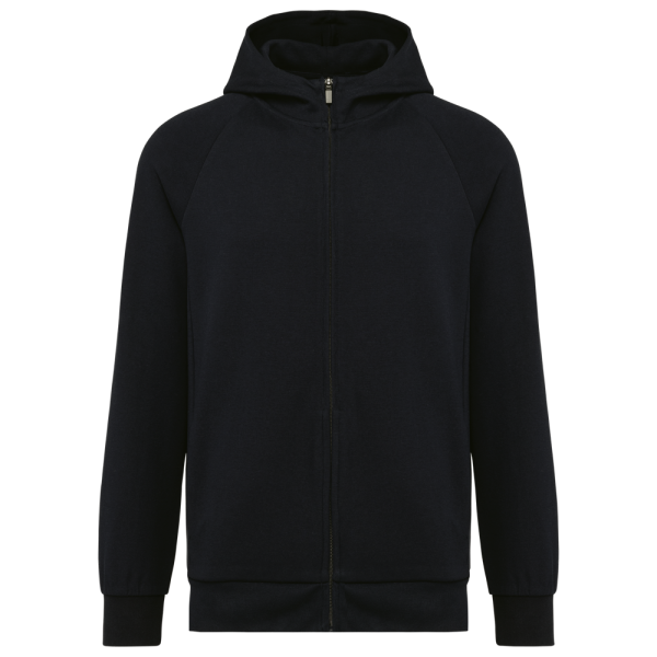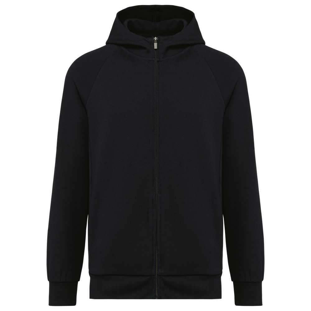 70% katoen / 26% polyester / 4% elasthan. Gekamd katoen. Interlockstof. LSI-behandeling (Low Shrinkage Interlock). Capuchon met 2 panelen, gevoerd met dezelfde stof als de rest van het jasje, geen koordje. Stiksel in de kraag. Nektape aan de binnenkant van de halsopening. Ton-sur-ton nylon rits met metalen trekker en nektape aan de binnenkant. Raglanmouwen. 1x1 ribboord. 2 zakken in de naad van het inzetsel. Geen merklabel, maar enkel een maatlabel voor eenvoudige personalisatie.