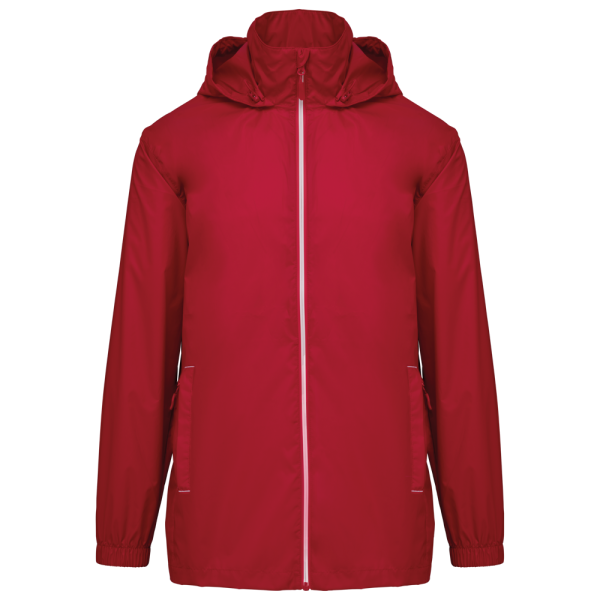 100% mat 210T polyester met PU-coating. Waterdichte stof 1500 mm. Waterdichte, thermisch verzegelde schoudernaden en capuchon. 2 zijzakken met rits en ritstrekker. 2 binnenzakken. Contrasterende ritssluiting vooraan. Aanpasbare capuchon met stoppers in de kraag en klittenband-knooplijst. Elastische mouwuiteinden. Afneembaar merklabel.
