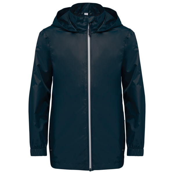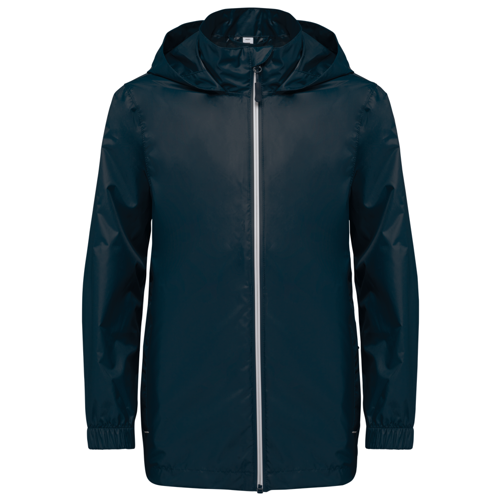 100% mat 210T polyester met PU-coating. Waterdichte stof 1500 mm. Waterdichte, thermisch verzegelde schoudernaden en capuchon. 2 zijzakken met rits en ritstrekker. 2 binnenzakken. Contrasterende ritssluiting vooraan. Capuchon in de kraag met klittenbandbevestiging. Elastische mouwuiteinden. Afneembaar merklabel.