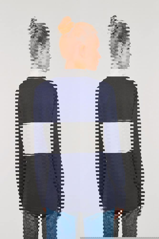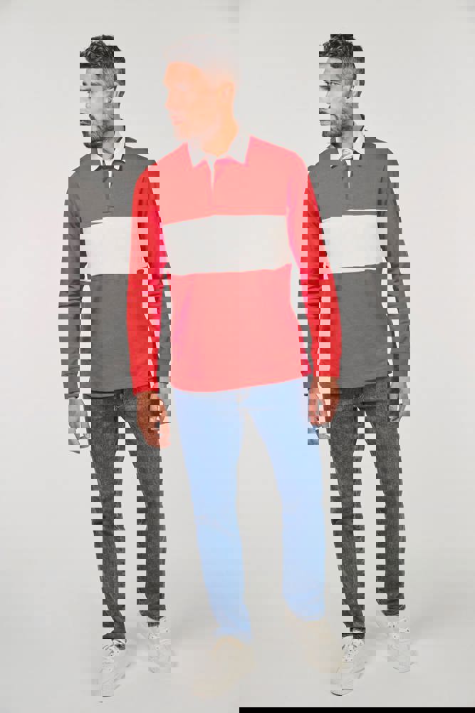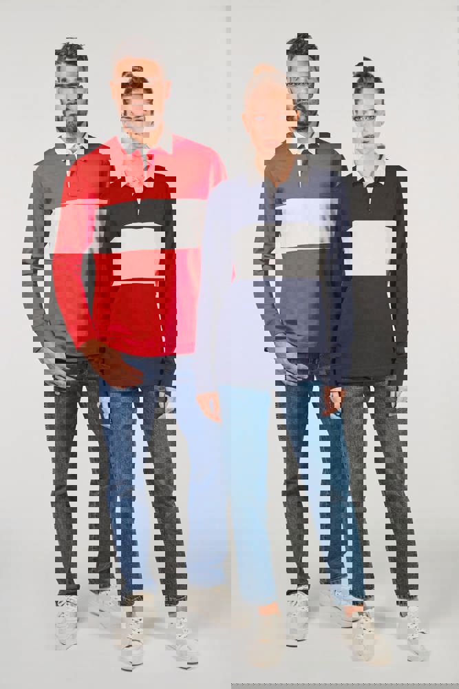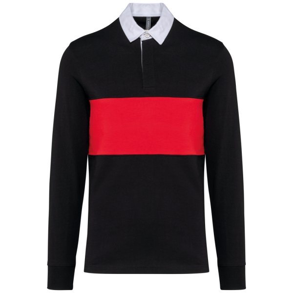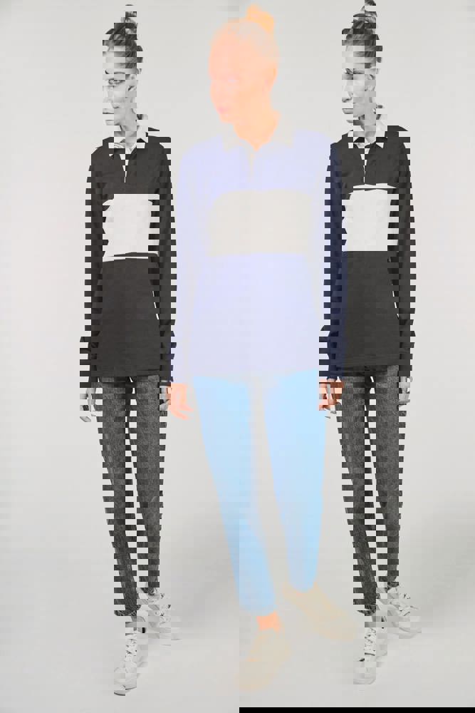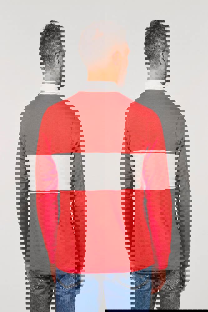 100 % katoen. Jerseystof. Regular fit. Kraag en knooplijst aan de binnenkant van wit twillkatoen. Knooplijst met 3 rubberen knopen. Mouwuiteinden in ribboord 1x1. Toon-op-toon nektape met visgraatmotief aan de kraag. Centrale strook aan de voorkant en de achterkant in contrasterende kleur. Zijsplitten onderaan met toon-op-toon visgraatmotief. Dubbel stiksel aan de mouwinzetten en -uiteinden. Afwerkingen met dubbel stiksel onderaan. Afneembaar merklabel.