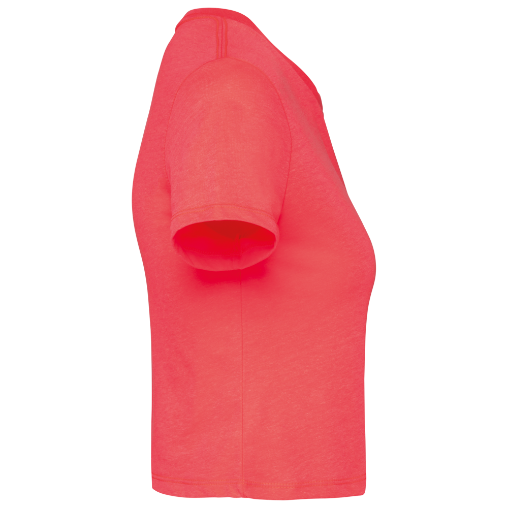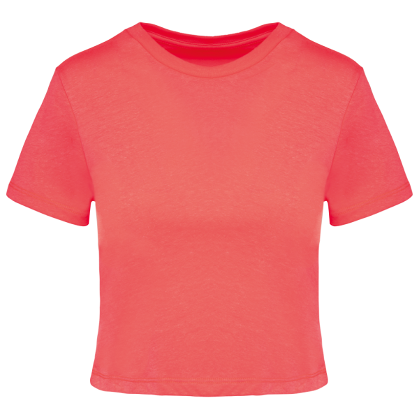 50% polyester / 25% katoen / 25% viscose. Jerseystof. Met antipluisbehandeling. Ronde hals. Rechte snit. Croptop. Ton-sur-ton nektape aan de halsopening. Dubbel stiksel aan de mouwuiteinden en aan de zoom. Buisvormige afwerking aan de mouwuiteinden. Geen merklabel, maar enkel een maatlabel voor eenvoudige personalisatie.