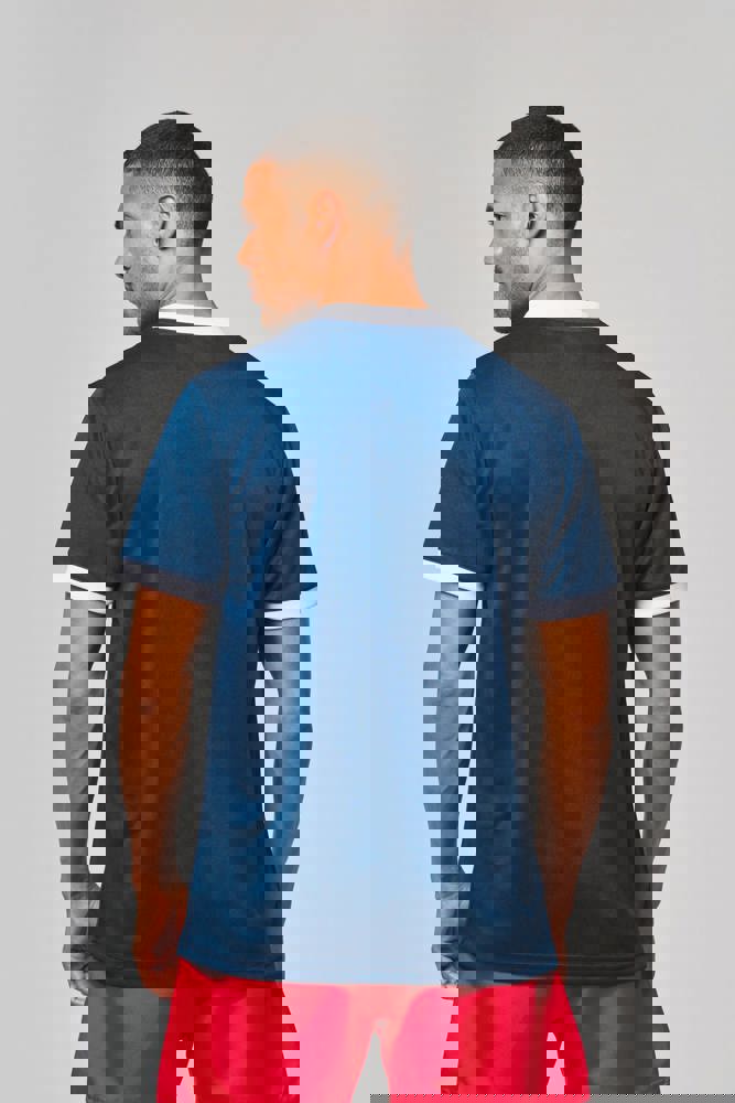 100% polyester. Interlock. Rechte snit. Cut-and-sew-techniek. Ronde hals in 1x1 ribtricot in contrasterend wit voor alle kleuren, met toon-op-toon interlock-inzetsel. Mouwuiteinden in 1x1 ribtricot in contrasterend wit voor alle kleuren. Toon-op-toon nektape van interlock. Verstevigde naden met dubbel stiksel aan de mouwuiteinden, de schouders en aan de zijkanten. Afwerking met dubbel stiksel aan de onderkant. Afneembaar merklabel.
