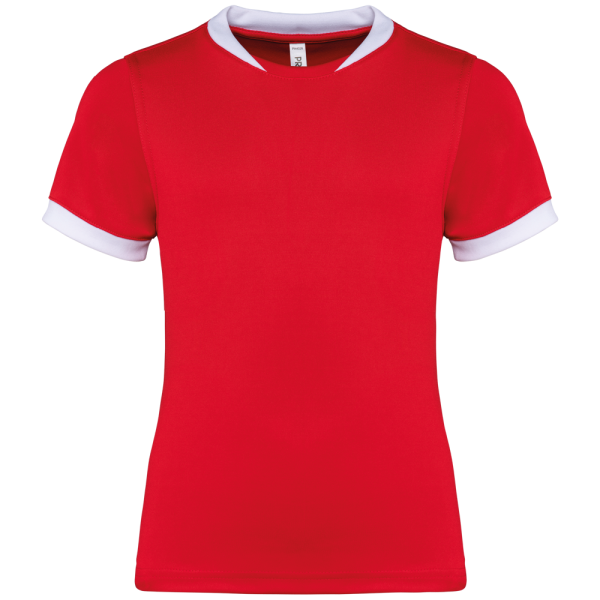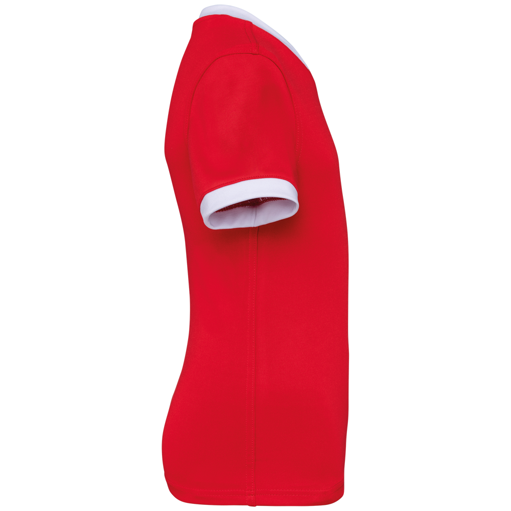 100% polyester. Interlock. Rechte snit. Cut-and-sew-techniek. Ronde hals in 1x1 ribtricot in contrasterend wit voor alle kleuren, met toon-op-toon interlock-inzetsel. Mouwuiteinden in 1x1 ribtricot in contrasterend wit voor alle kleuren. Toon-op-toon nektape van interlock. Verstevigde naden met dubbel stiksel aan de mouwopeningen, de schouders en opzij. Afwerking met dubbel stiksel onderaan. Afneembaar merklabel.