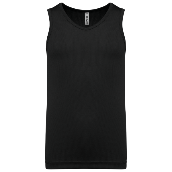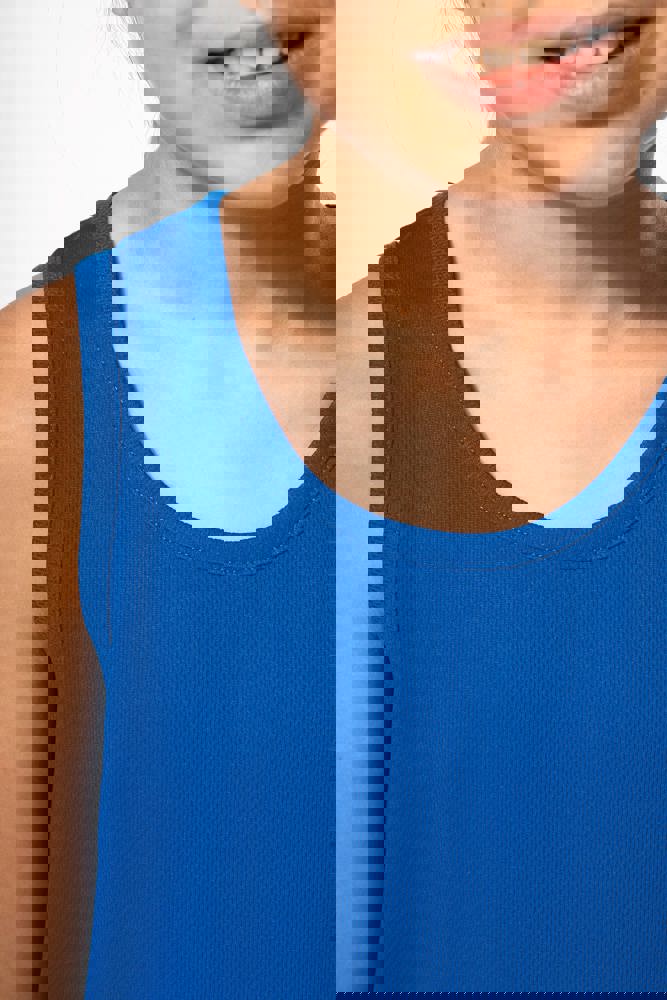 100% birdseye-polyester. Lichte, sneldrogende stof. Biesje aan halsopening en armsgaten. Dubbel stiksel op de zoom onderaan. Afneembaar merklabel.