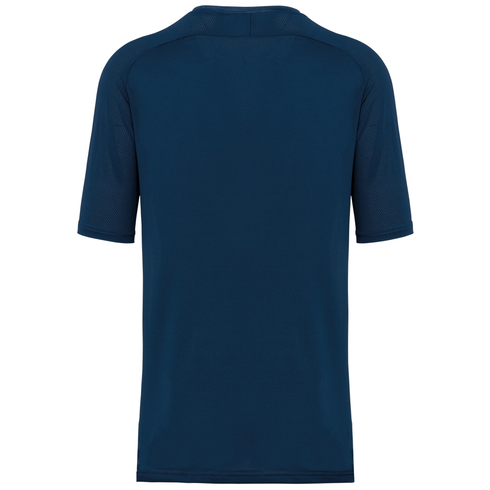 90% polyester / 10% elasthan. Birdseye-deel : 92% polyester / 8% elasthan. Contrasterende panelen in 'birdseye'. Rechte snit. Raglanmouwen. Ronde hals in jersey met toon op toon inzetsel aan de voorkant van de kraag. Toon op toon nektape in jersey. Contrasterende panelen (of effen voor de kleur Black) in birdseyetricot op de zijkanten, de mouwen en de rug. Dubbel stiksel aan mouwuiteinden en onderkant. Tear-away merklabel.