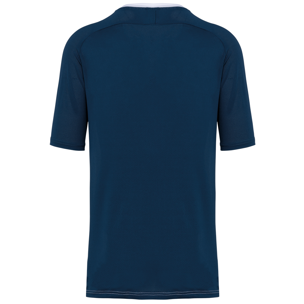 90% polyester / 10% elasthan. Birdseye-deel : 92% polyester / 8% elasthan. Contrasterende panelen in 'birdseye'. Rechte snit. Raglanmouwen. Ronde hals in jersey met toon op toon inzetsel aan de voorkant van de kraag. Toon op toon nektape in jersey. Contrasterende panelen (of effen voor de kleur Black) in birdseyetricot op de zijkanten, de mouwen en de rug. Dubbel stiksel aan mouwuiteinden en onderkant. Tear-away merklabel.