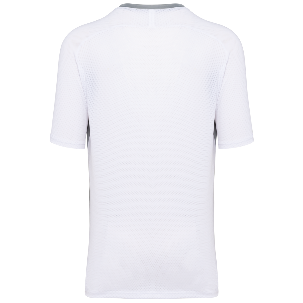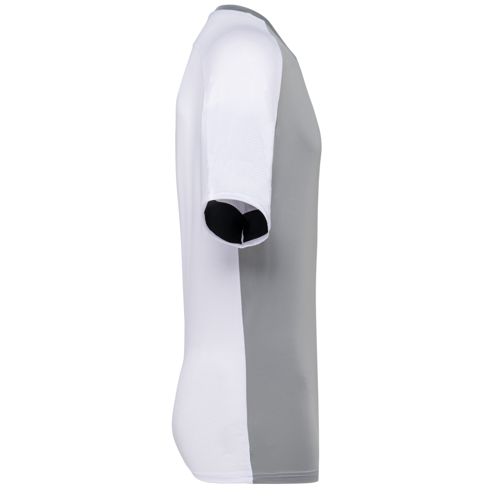 90% polyester / 10% elasthan. Birdseye-deel : 92% polyester / 8% elasthan. Contrasterende panelen in 'birdseye'. Rechte snit. Raglanmouwen. Ronde hals in jersey met toon op toon inzetsel aan de voorkant van de kraag. Toon op toon nektape in jersey. Contrasterende panelen (of effen voor de kleur Black) in birdseyetricot op de zijkanten, de mouwen en de rug. Dubbel stiksel aan mouwuiteinden en onderkant. Tear-away merklabel.