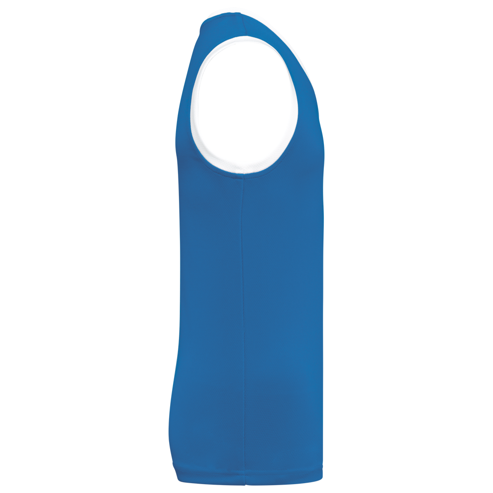 100% birdseye-polyester. V-hals. Contrasterend biesje aan hals en armsgaten. Dubbel stiksel op de zoom onderaan. Afneembaar merklabel.