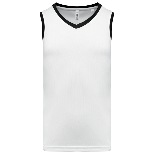 100% birdseye-polyester. V-hals. Contrasterend biesje aan hals en armsgaten. Dubbel stiksel op de zoom onderaan. Afneembaar merklabel.