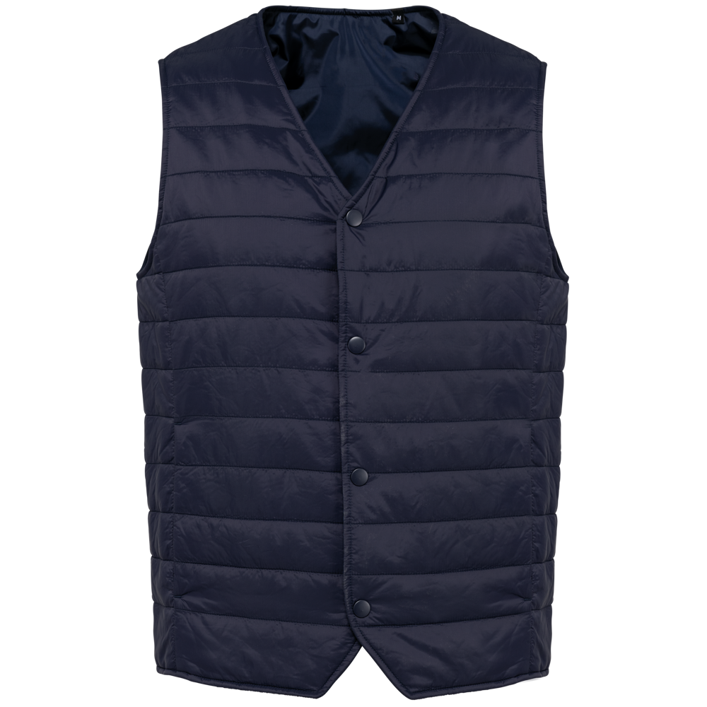 100% polyamide. Gevuld met Thinsulate®. Twee zijzakken. Sluit met ton-sur-ton drukknopen. Drukkersrits aan de linkerkant. Heel dun om onder een jasje te kunnen dragen. Geen merklabel, maar enkel een maatlabel voor eenvoudige personalisatie.